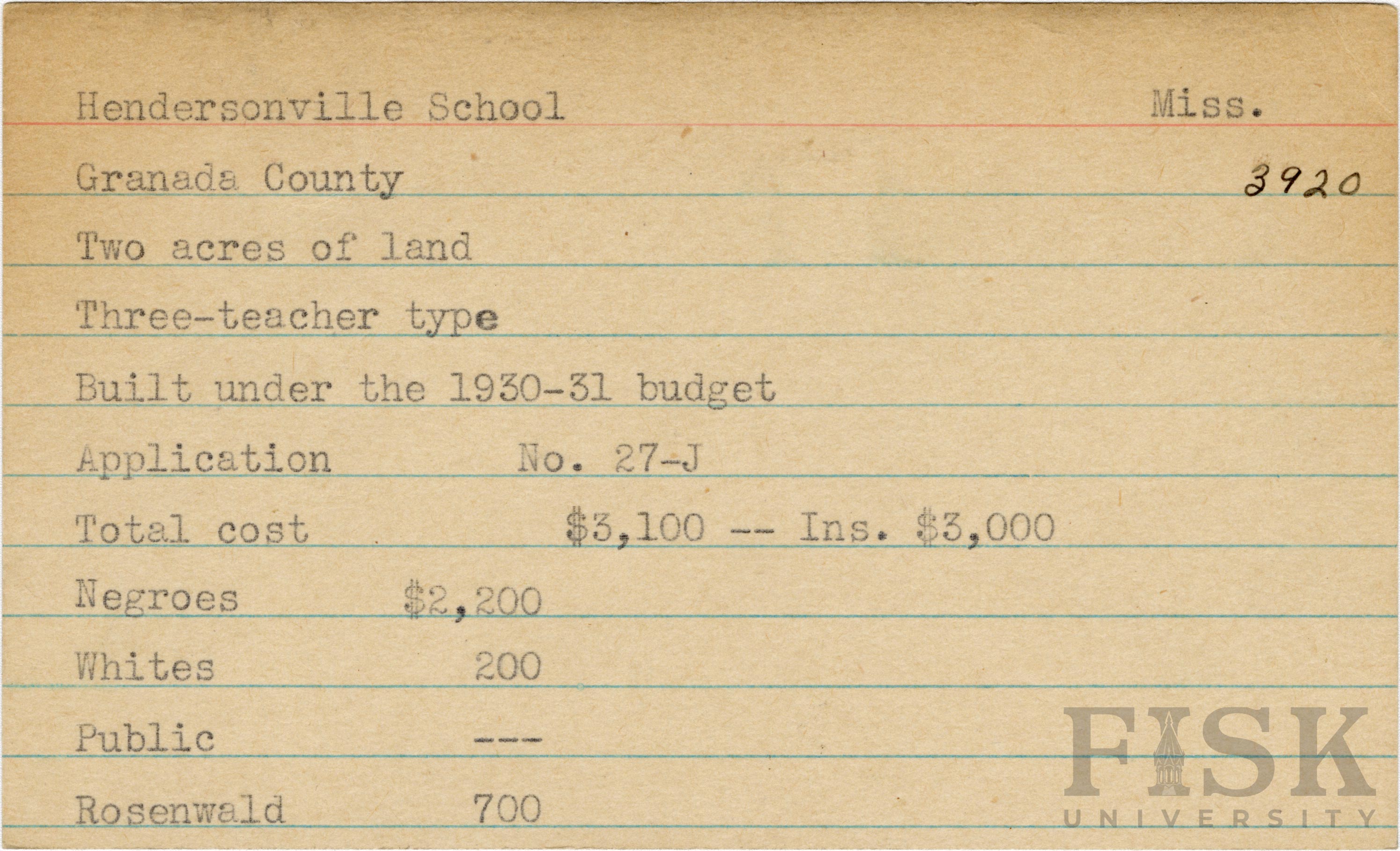 School card from Rosenwald Fund for Hendersonville School in Grenada County, Mississippi with a section added to the budget contributions that says, "Ins. $3,000"