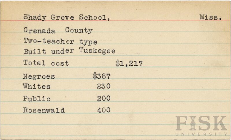 - School card from Rosenwald Fund for Shady Grove School in Grenada County, Mississippi