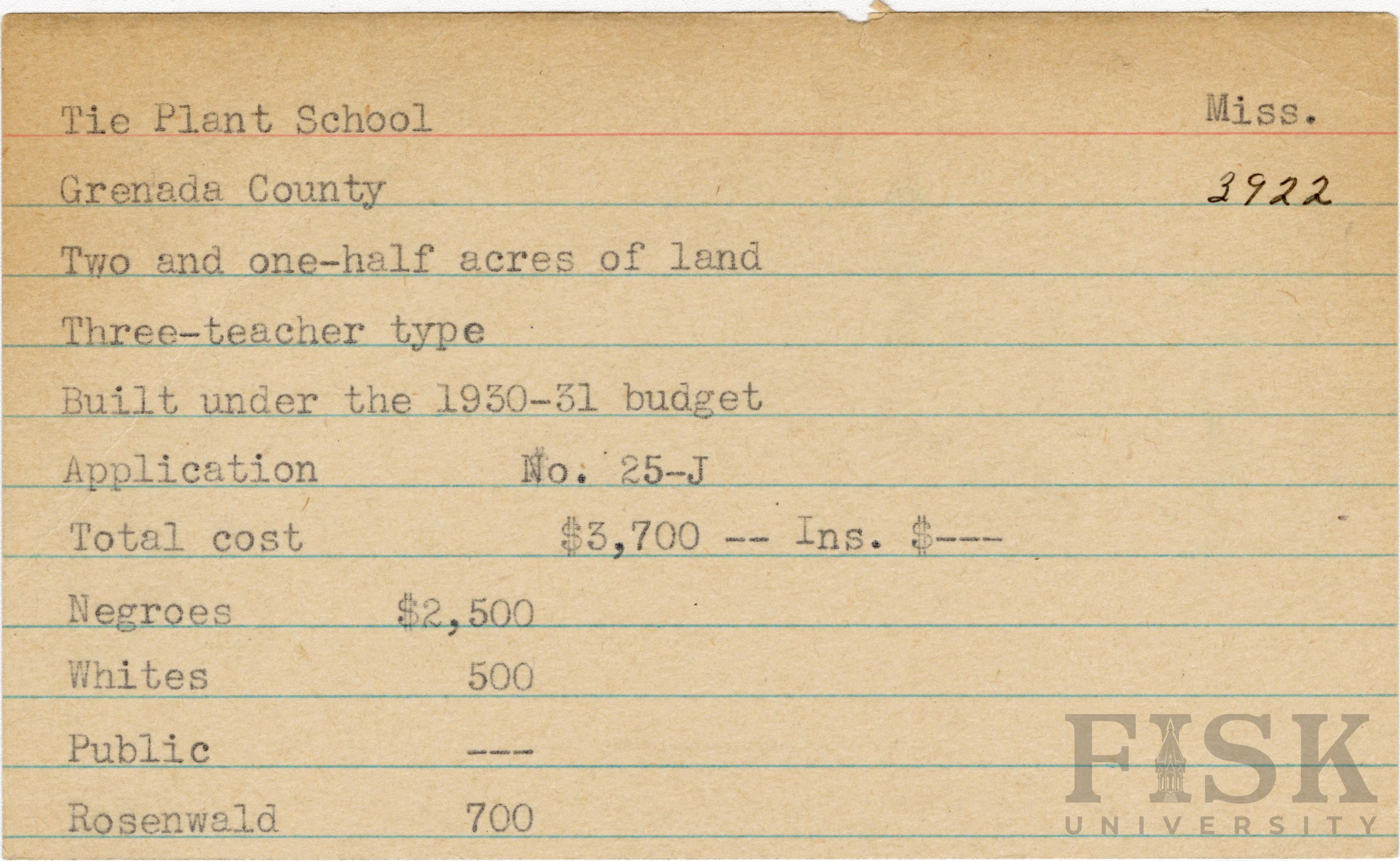 - School card from Rosenwald Fund for Tie Plant School in Grenada County, Mississippi