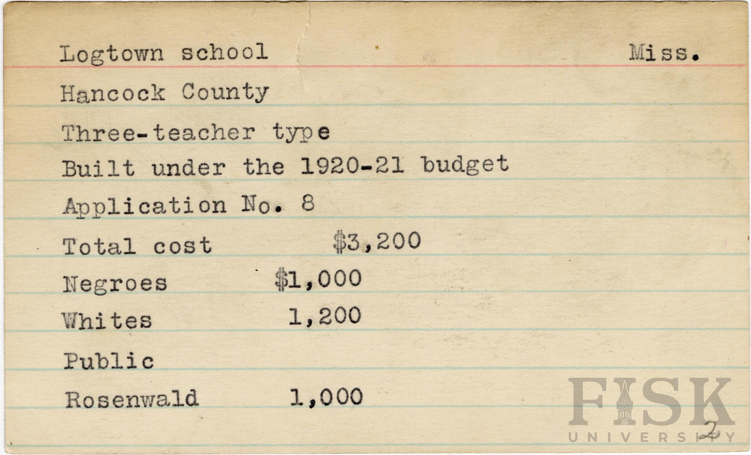 - School card from Rosenwald Fund for Logtown School in Hancock County, Mississippi