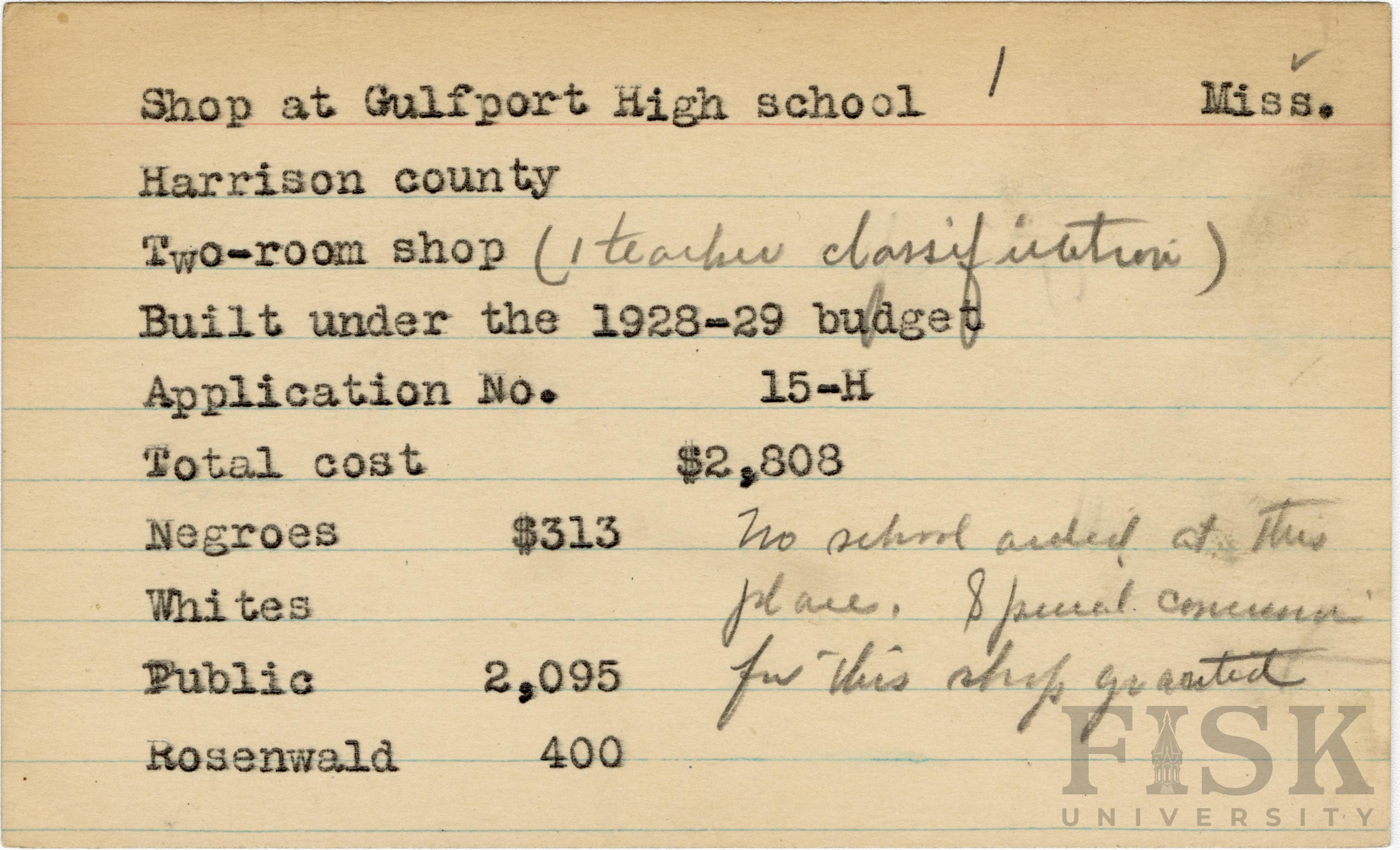 - School card from Rosenwald Fund for the two room shop at Gulfport High School in Harrison County, Mississippi with a handwritten note that says, "no school aided at this place. Special concession for this shop granted"