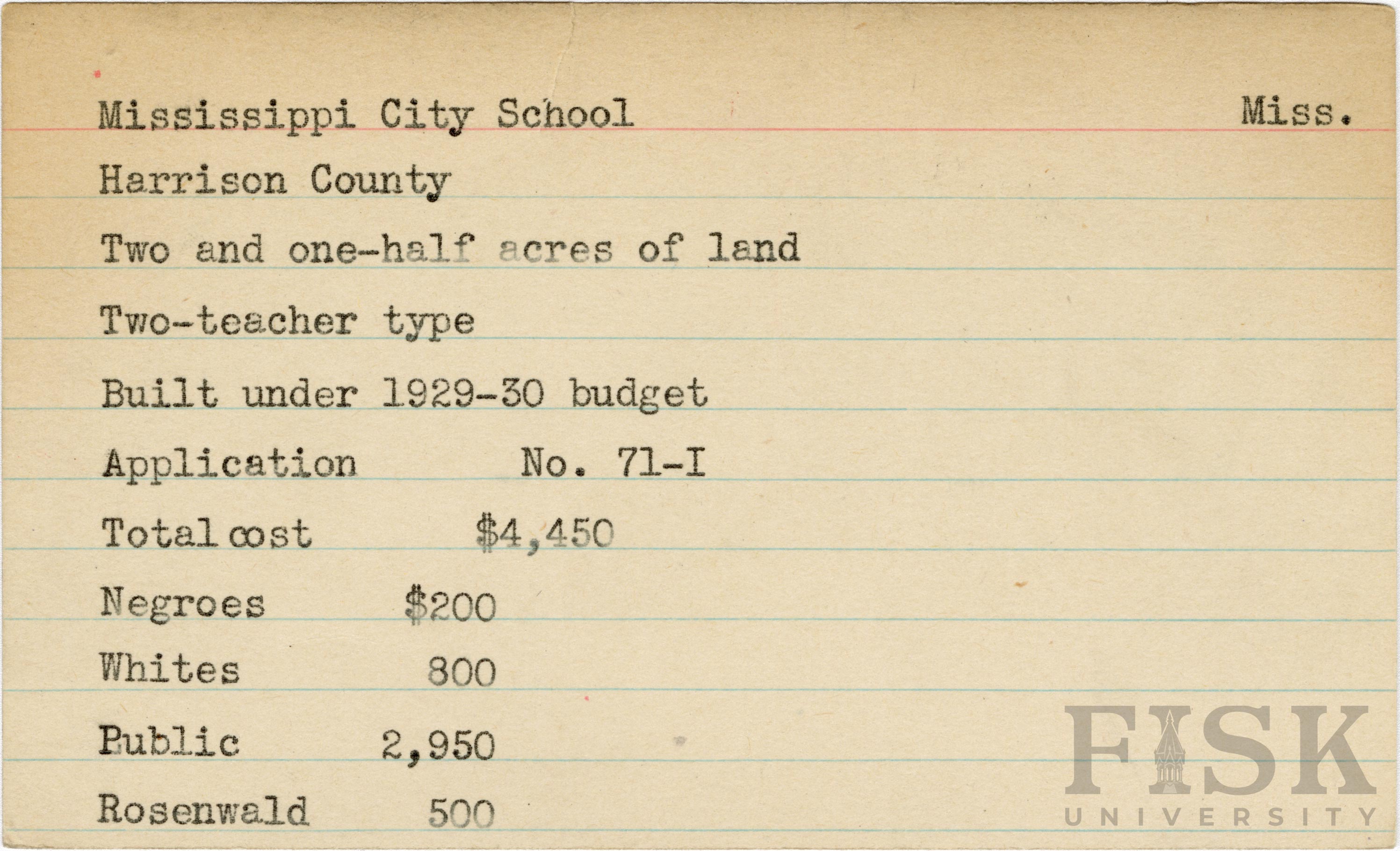- School card from Rosenwald Fund for Mississippi City School in Harrison County, Mississippi