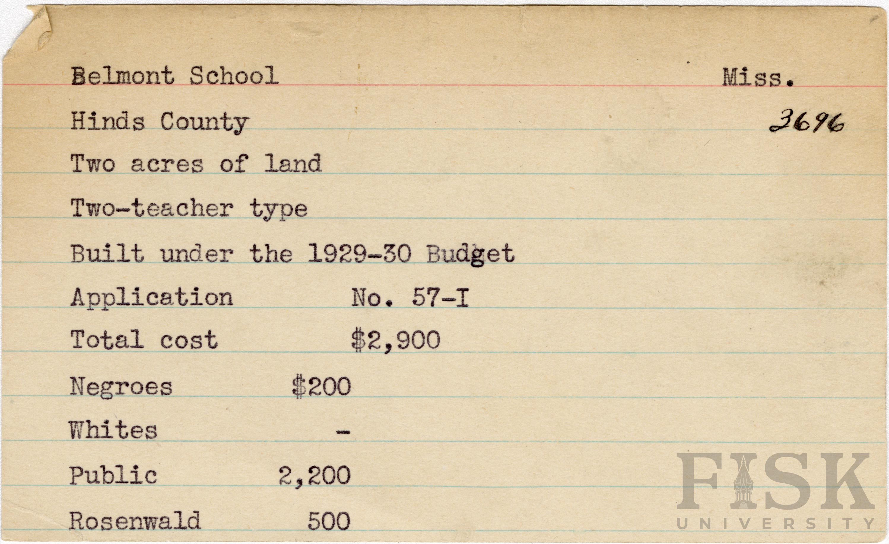 - School card from Rosenwald Fund for Belmont School in Hinds County, Mississippi