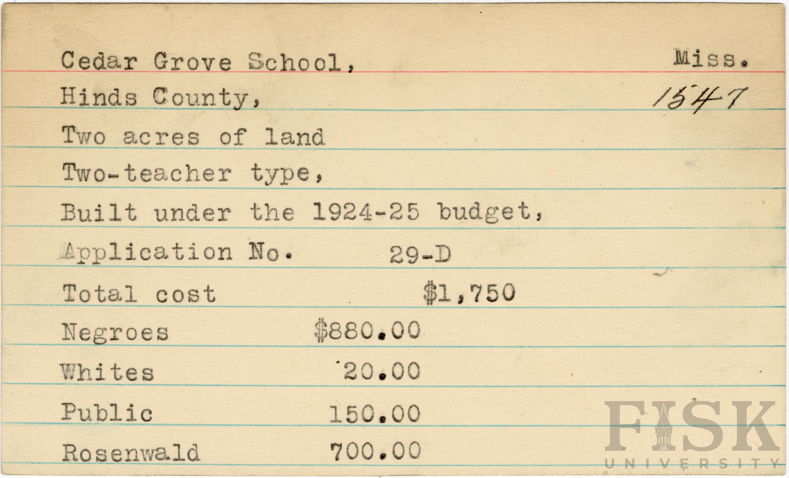 - School card from Rosenwald Fund for Cedar Grove School in Hinds County, Mississippi