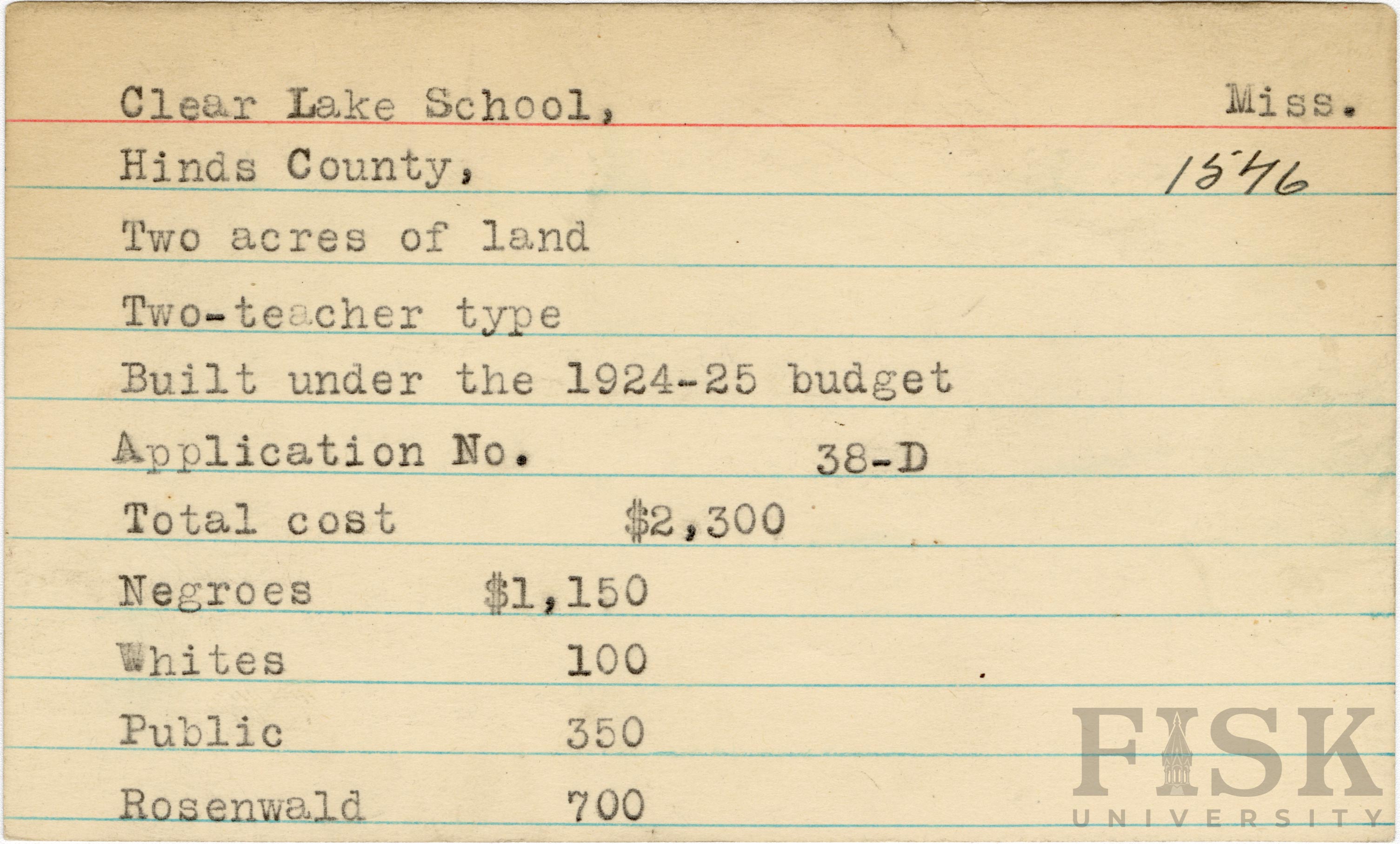 - School card from Rosenwald Fund for Clear Lake School in Hinds County, Mississippi