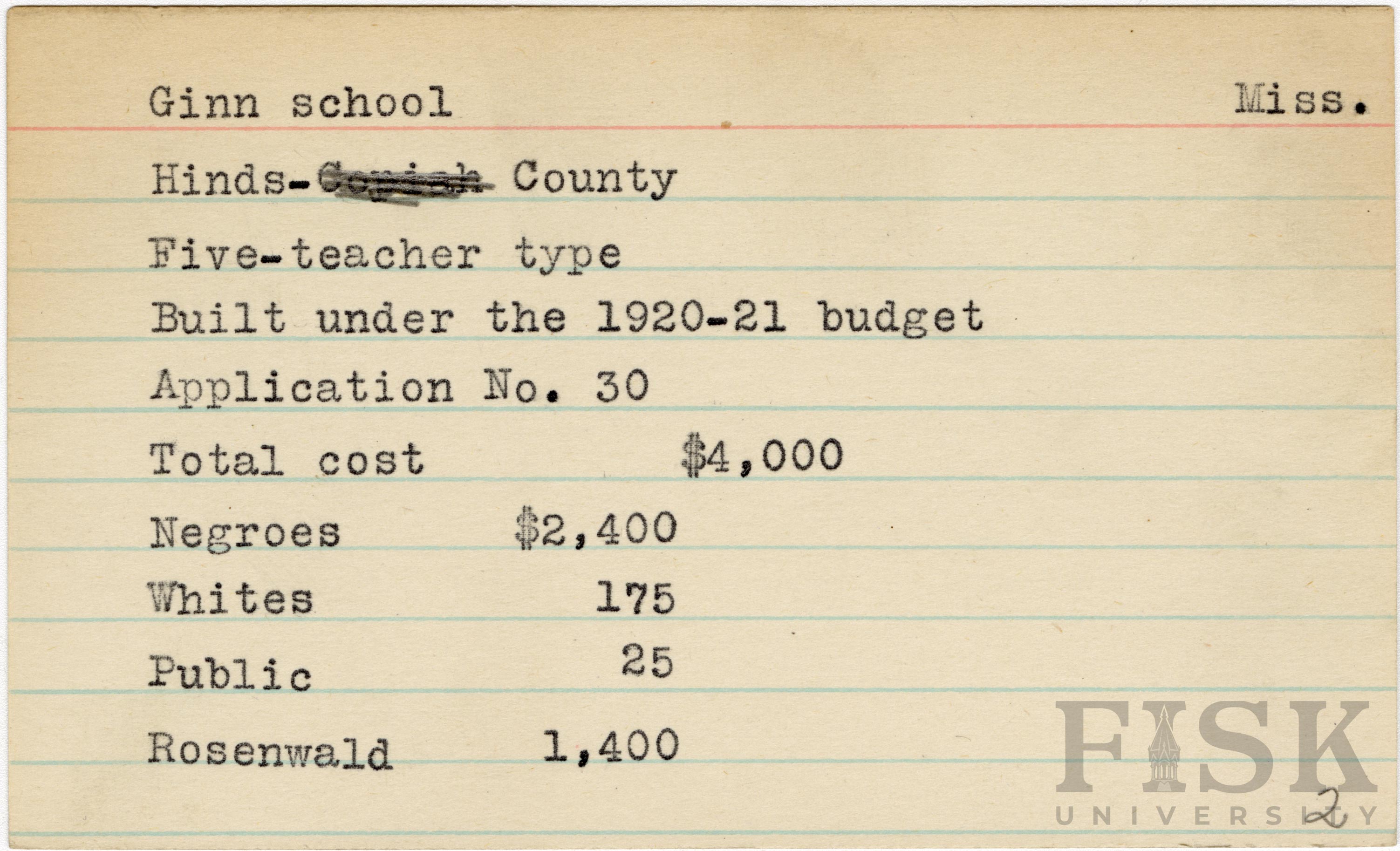 - School card from Rosenwald Fund for Ginn School in Hinds County, Mississippi