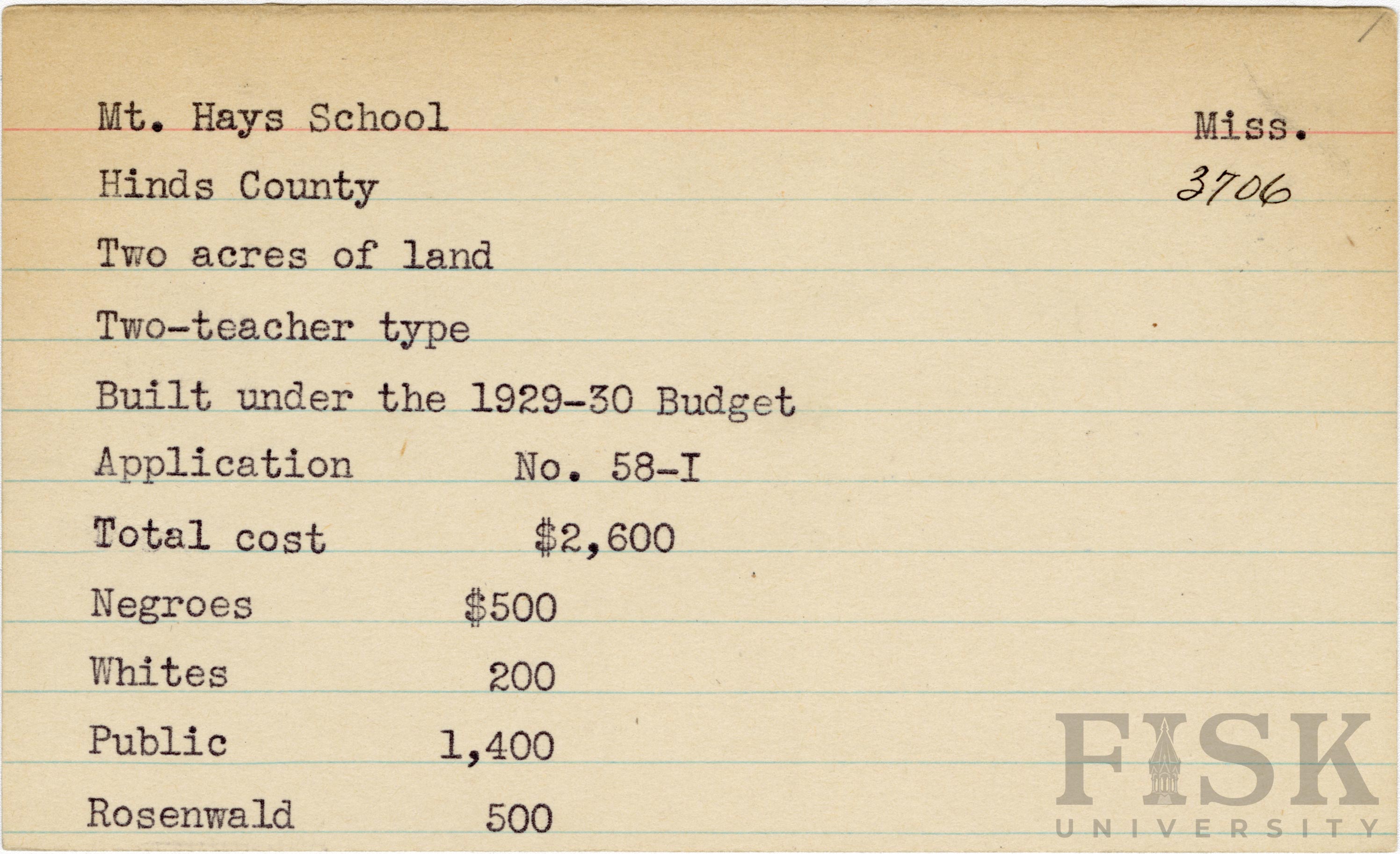 - School card from Rosenwald Fund for Mt. Hays School in Hinds County, Mississippi