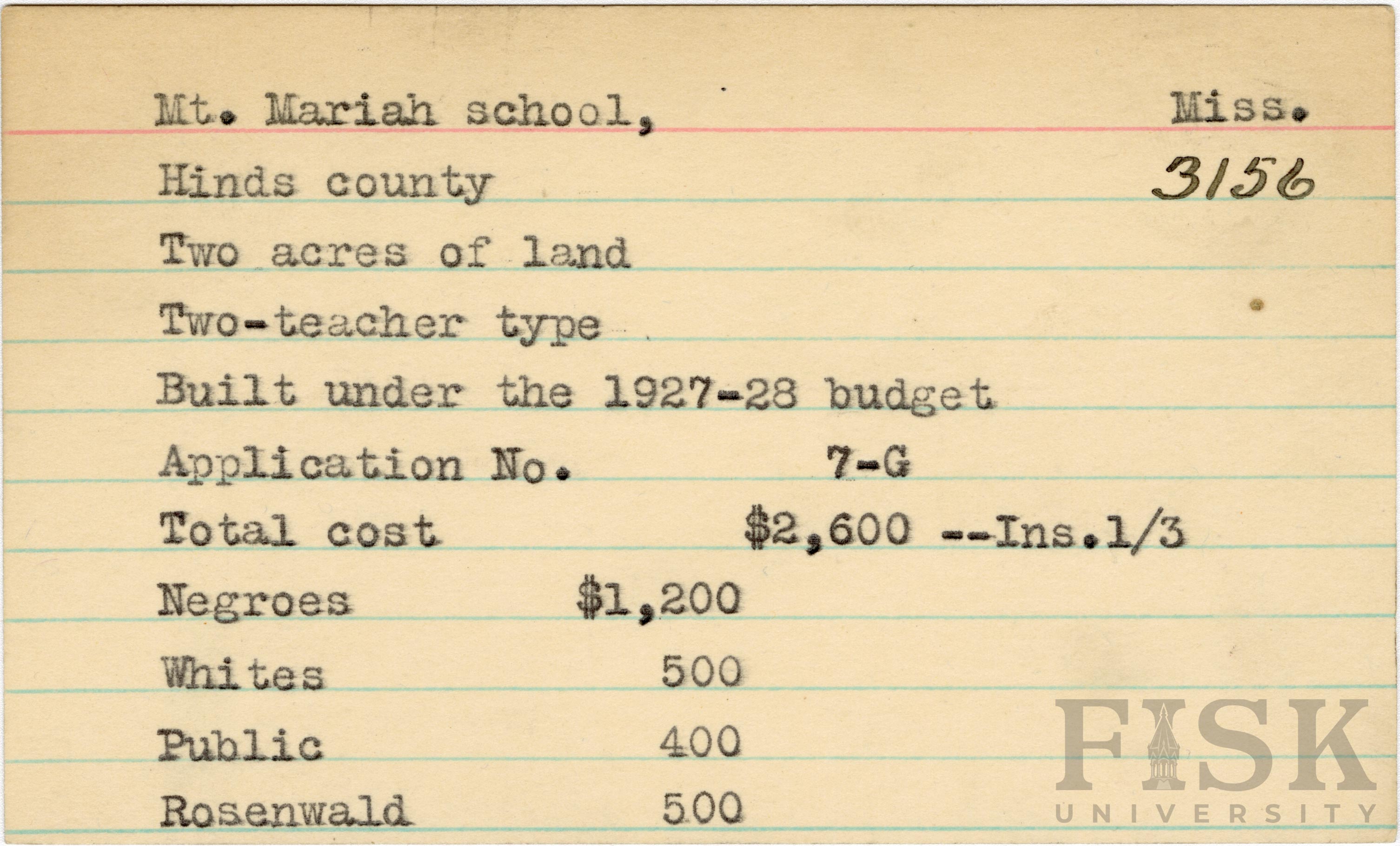 - School card from Rosenwald Fund for Mt. Mariah School in Hinds County, Mississippi with a section added to the budget contributions that says, "Ins. 1/3"