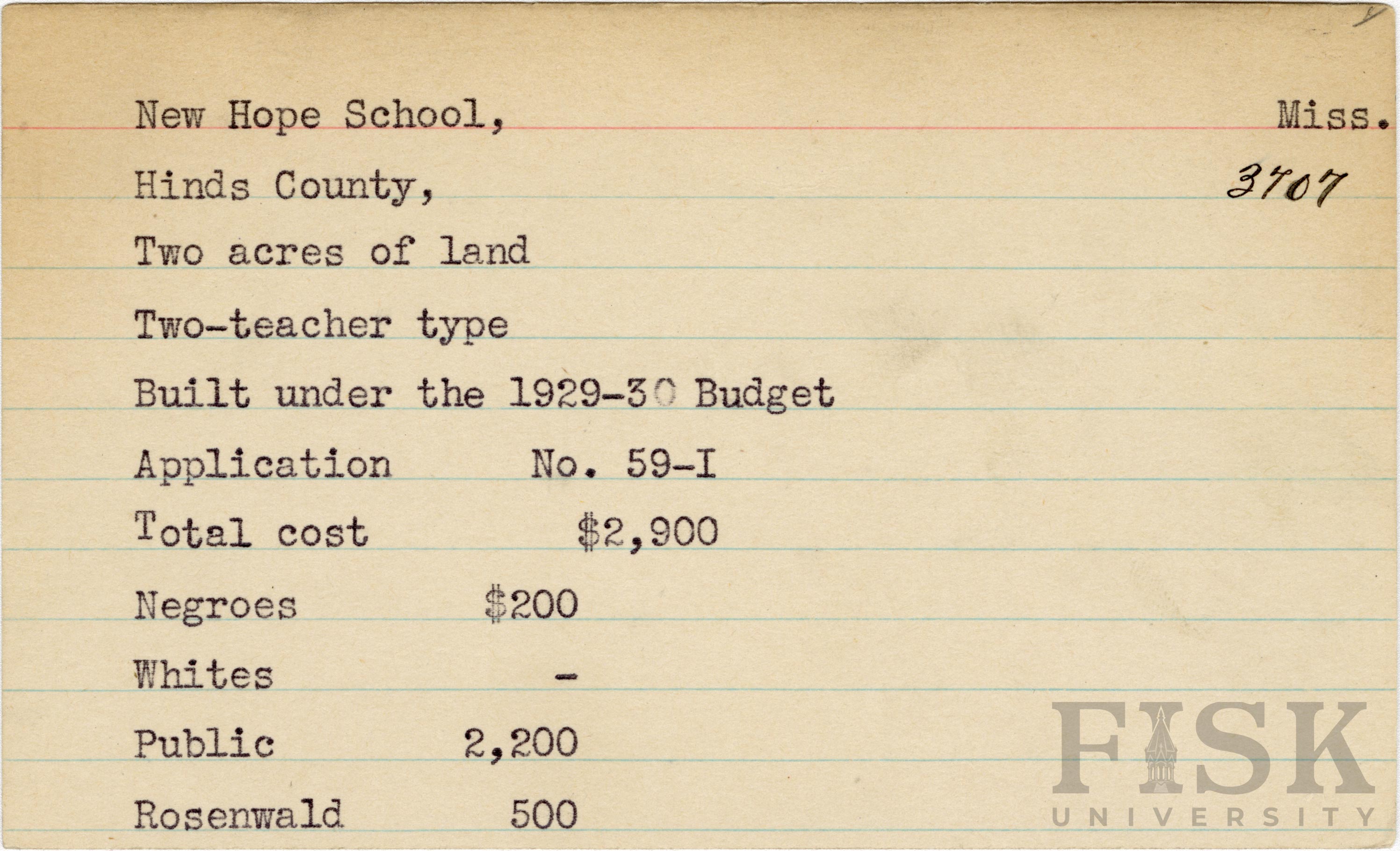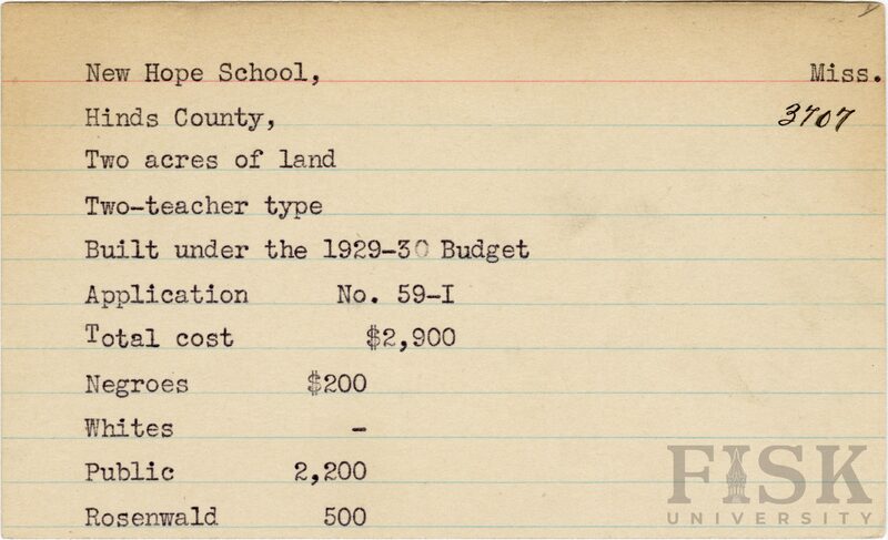 - School card from Rosenwald Fund for New Hope School in Hinds County, Mississippi
