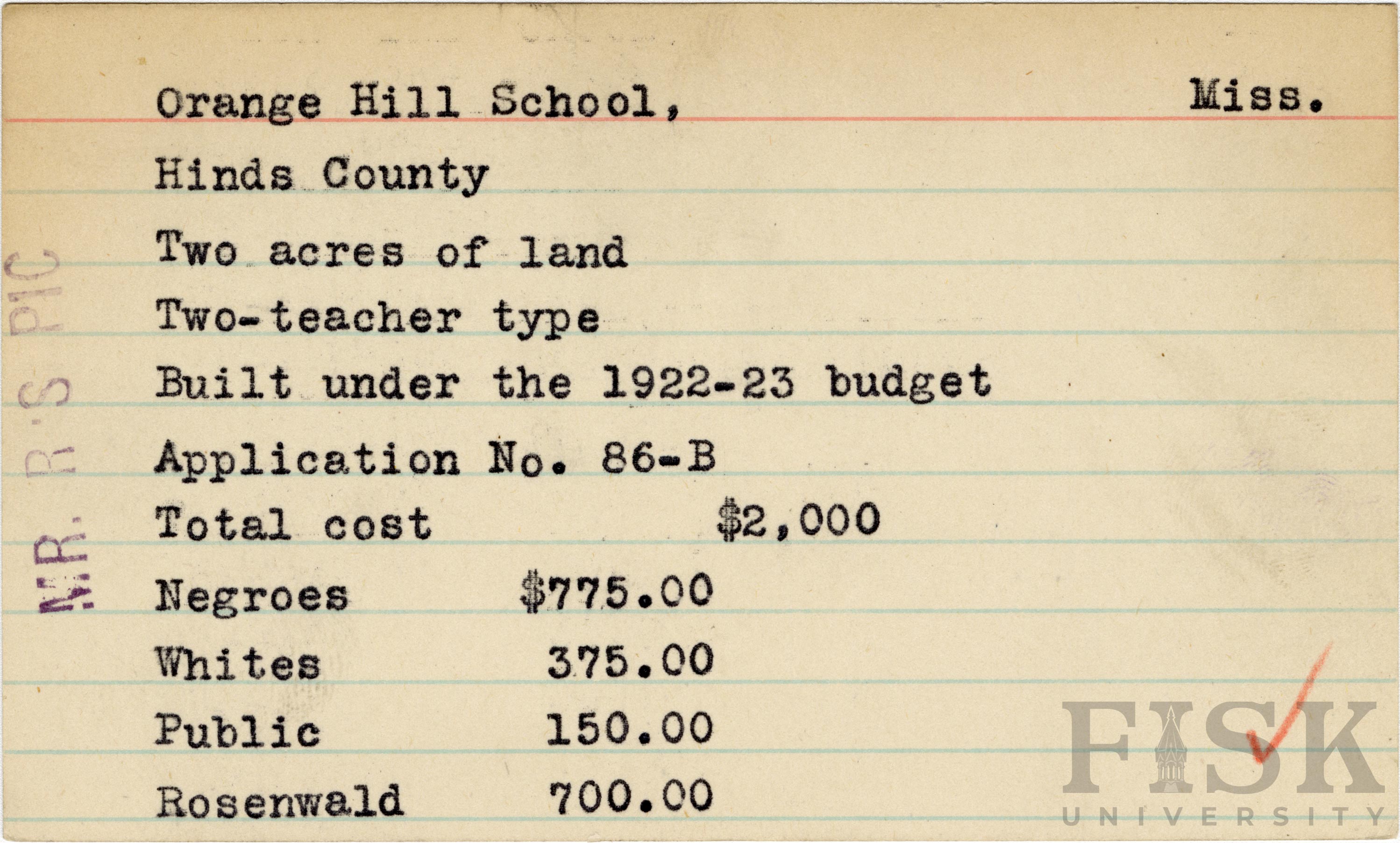 - School card from Rosenwald Fund for Orange Hill School in Hinds County, Mississippi with a note on the far left of the card that says, "Mr. R's Pic"