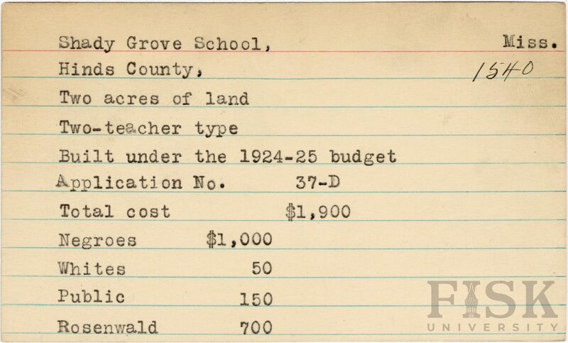 - School card from Rosenwald Fund for Shady Grove School in Hinds County, Mississippi