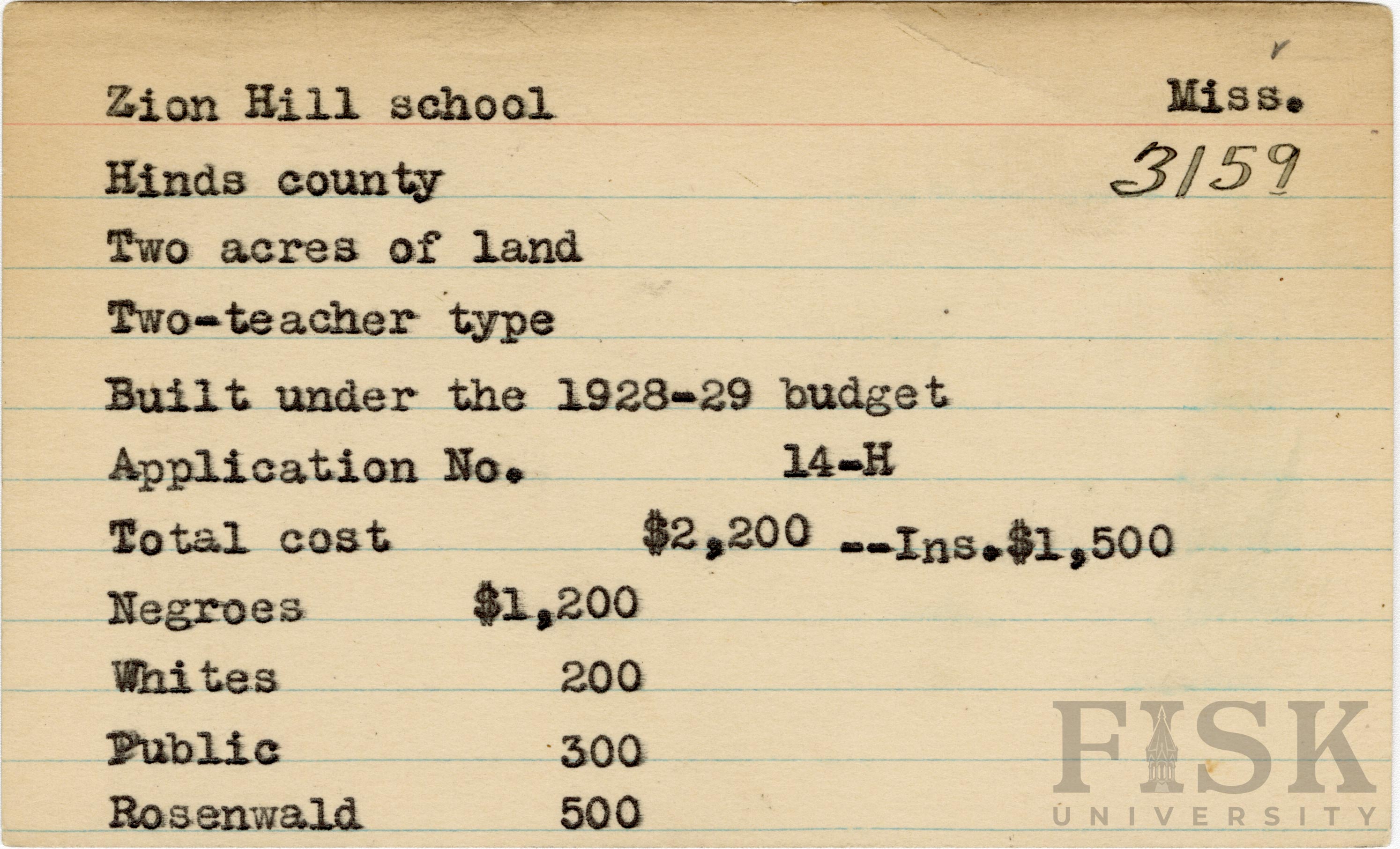 - School card from Rosenwald Fund for Zion Hill School in Hinds County, Mississippi with a section added to the budget contributions that says, "Ins. $1,500"