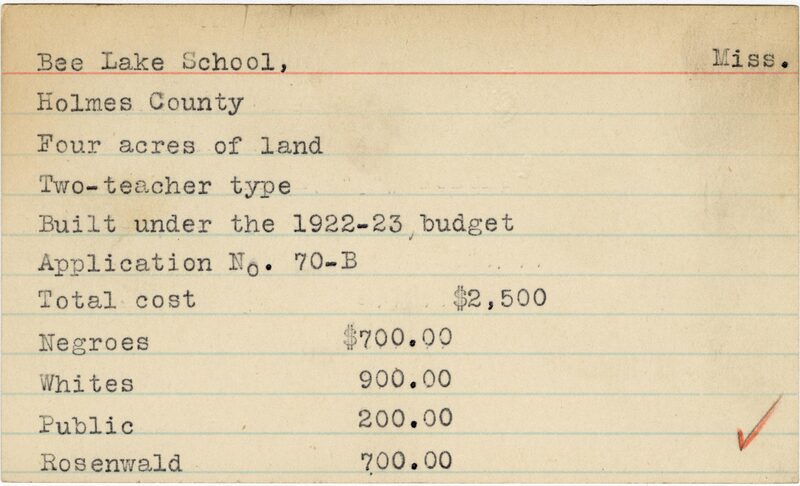 - School card from Rosenwald Fund for Bee Lake School in Holmes County, Mississippi