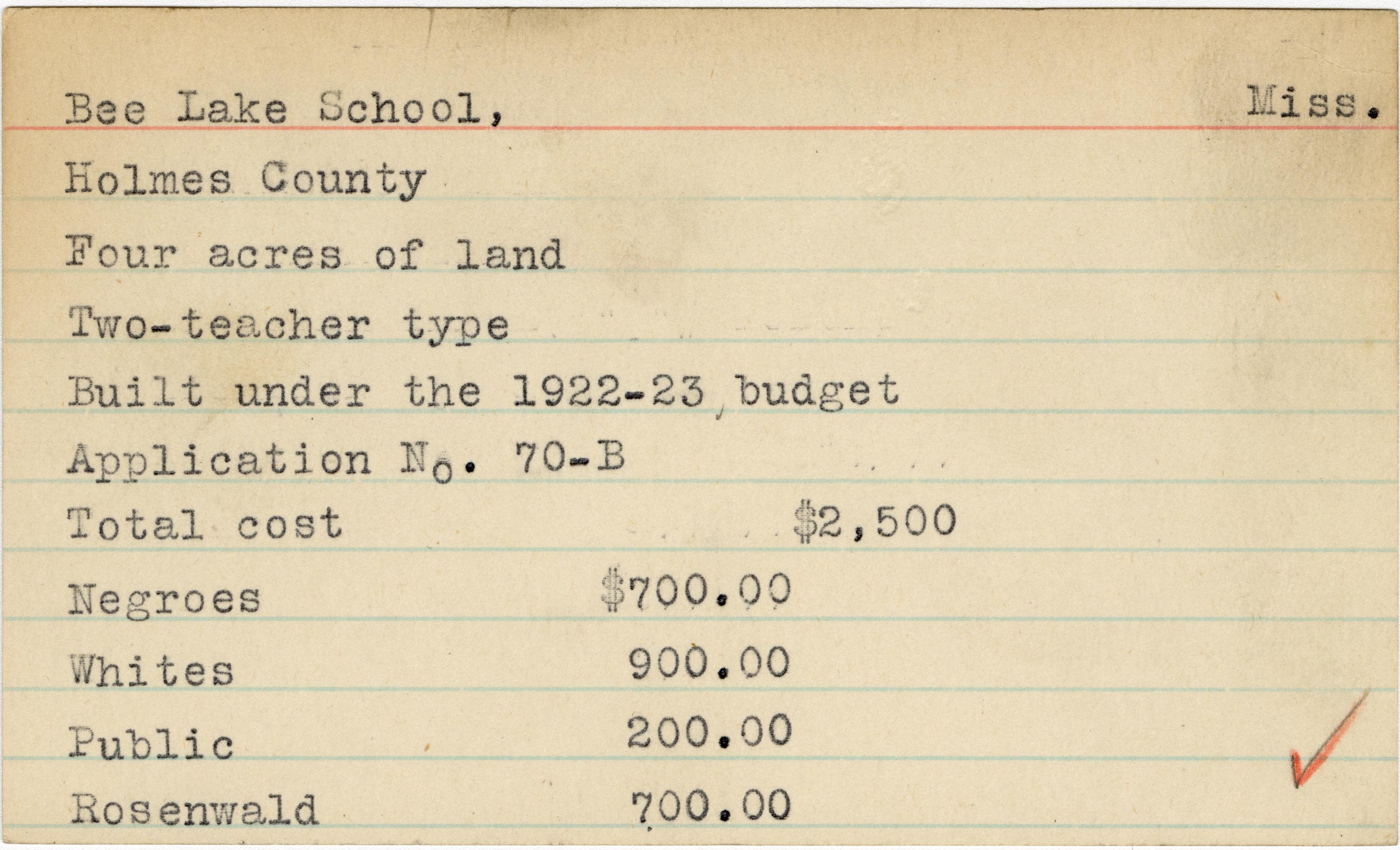School card from Rosenwald Fund for Bee Lake School in Holmes County, Mississippi