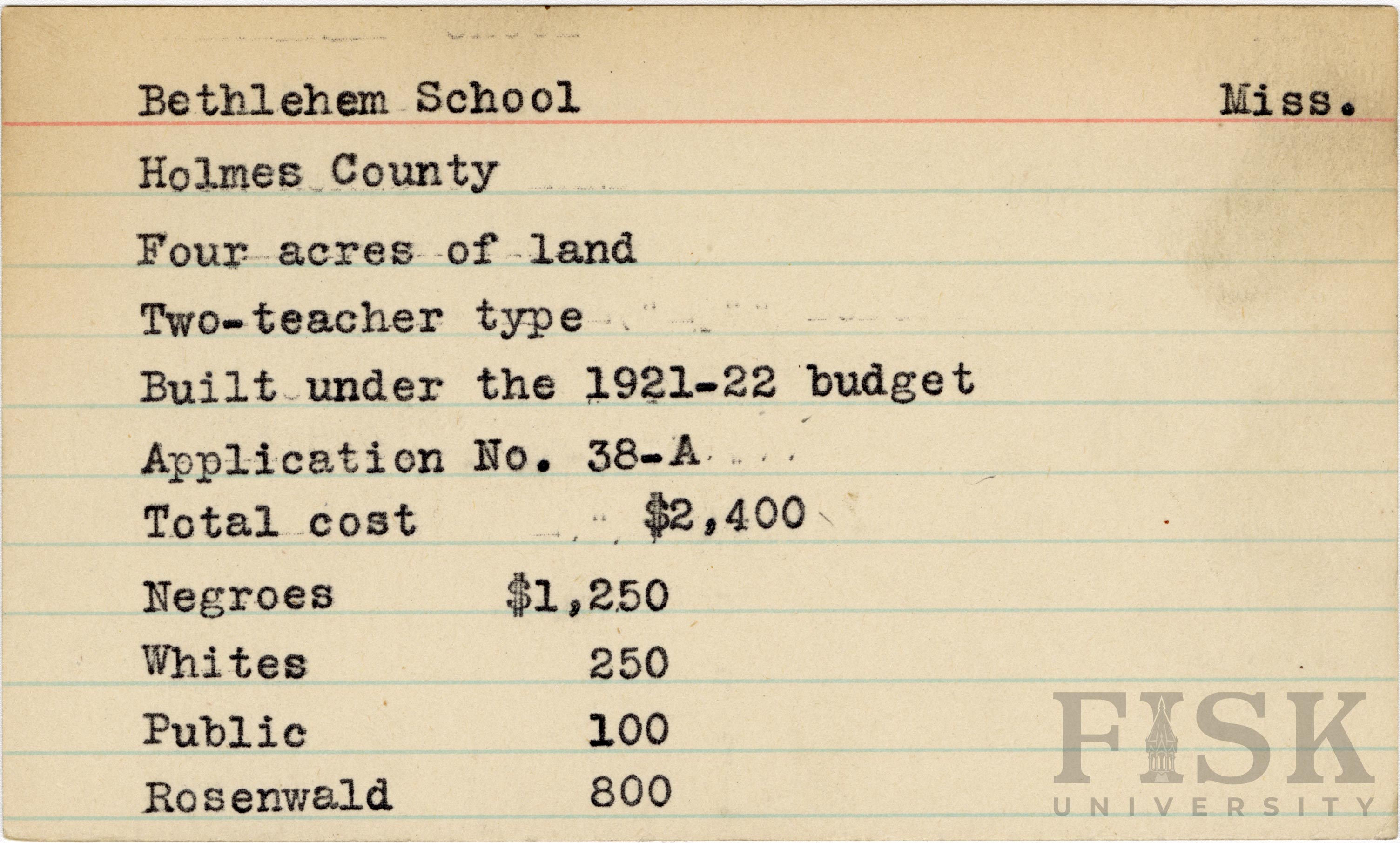 - School card from Rosenwald Fund for Bethlehem School in Holmes County, Mississippi