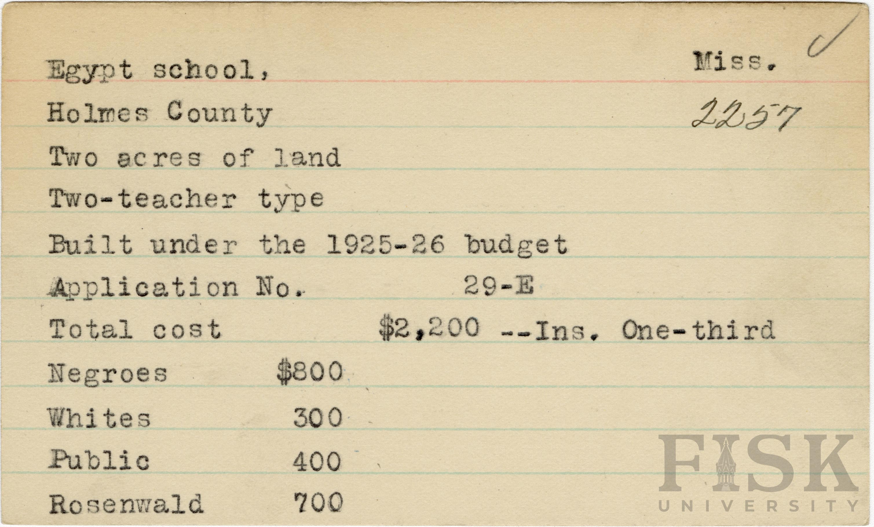 - School card from Rosenwald Fund for Egypt School in Holmes County, Mississippi with a section added to the budget contributions that says, "Ins. One-third"