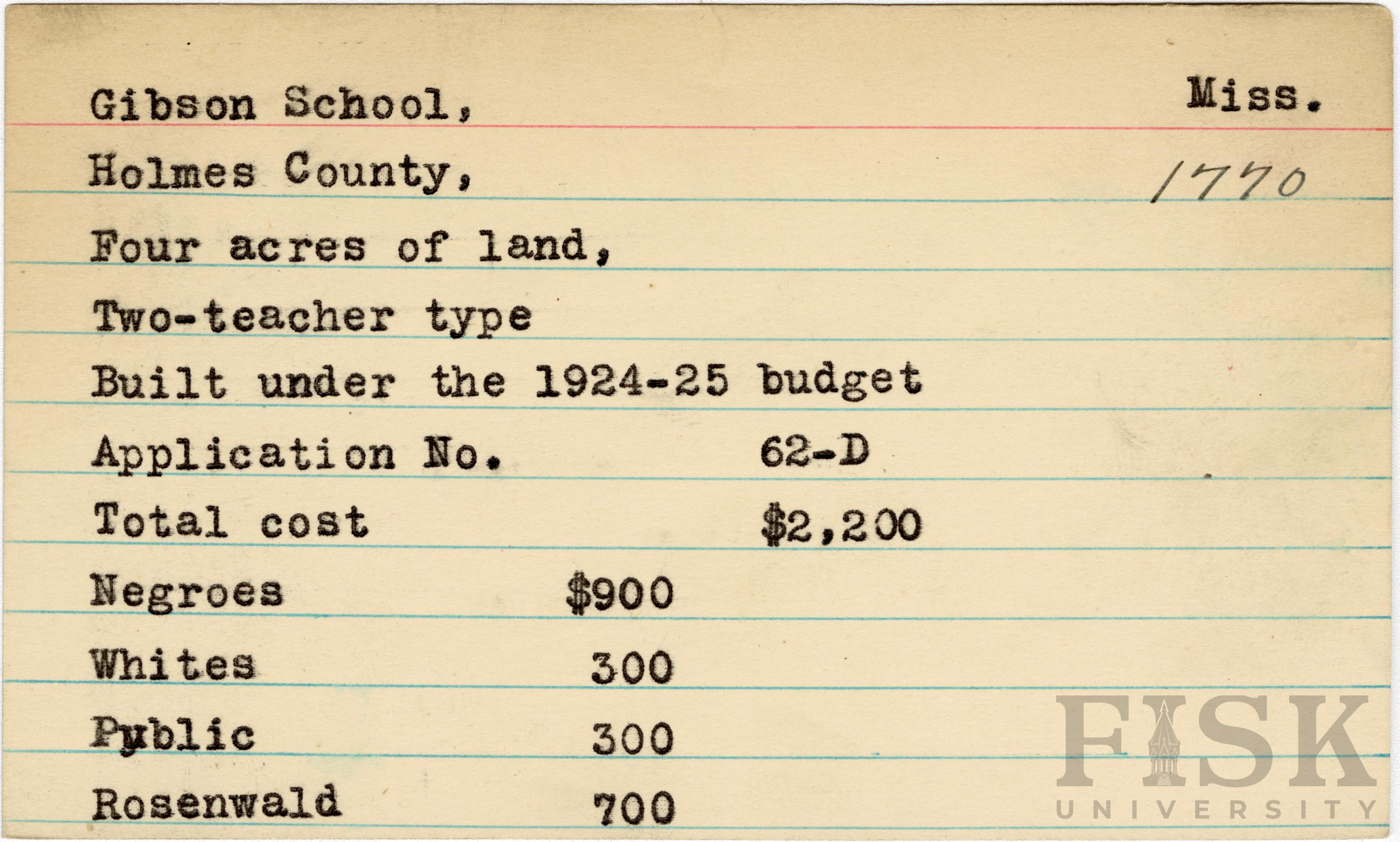 - School card from Rosenwald Fund for Gibson School in Holmes County, Mississippi