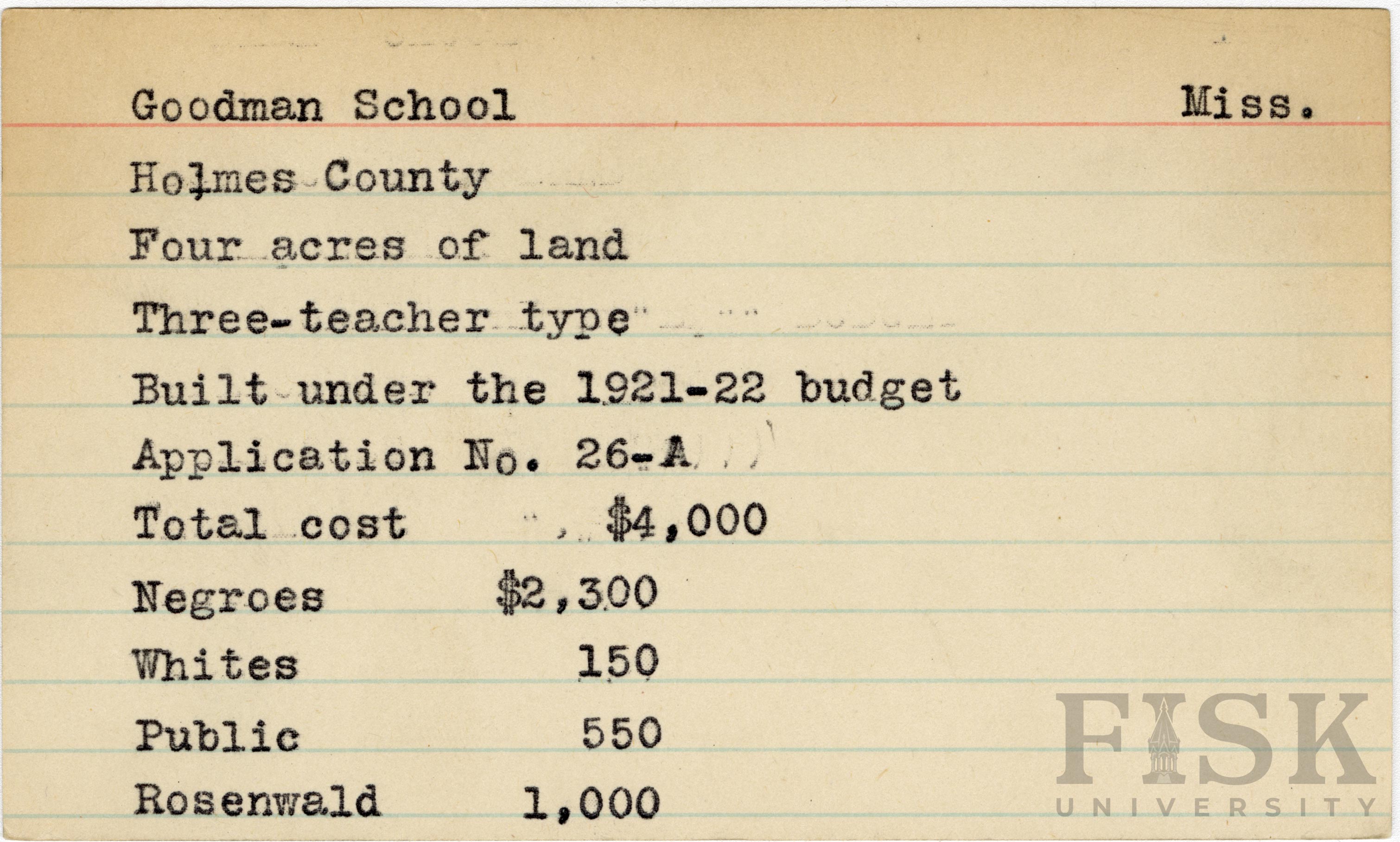 - School card from Rosenwald Fund for Goodman School in Holmes County, Mississippi