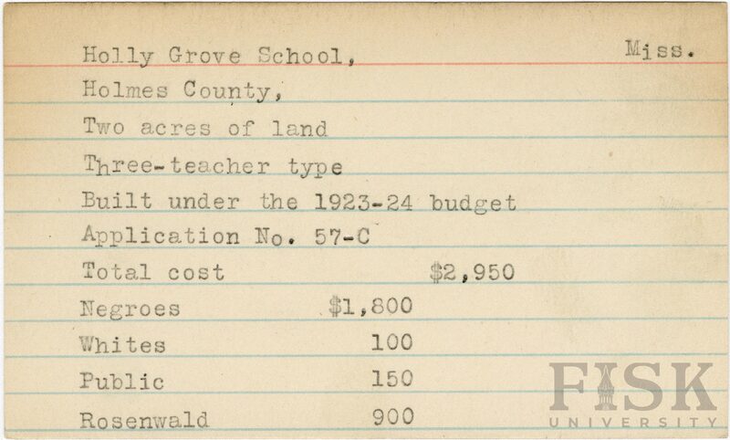- School card from Rosenwald Fund for Holly Grove School in Holmes County, Mississippi