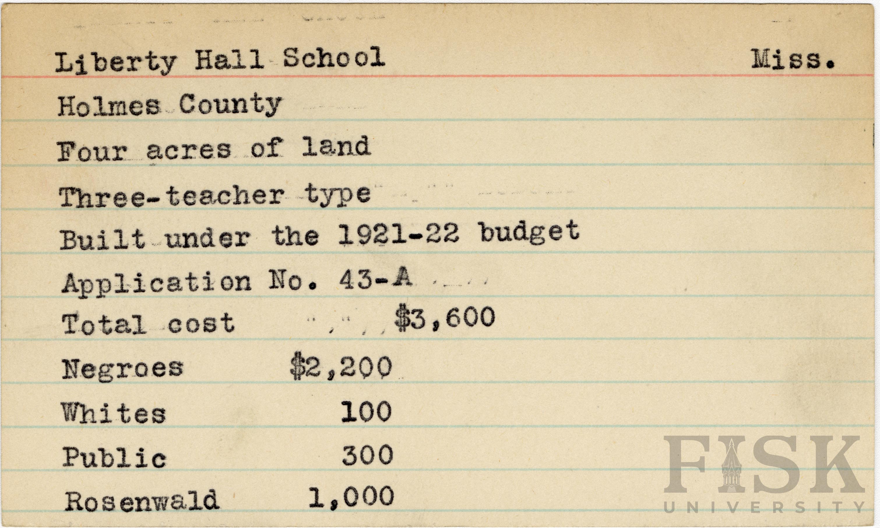 - School card from Rosenwald Fund for Liberty Hall School in Holmes County, Mississippi