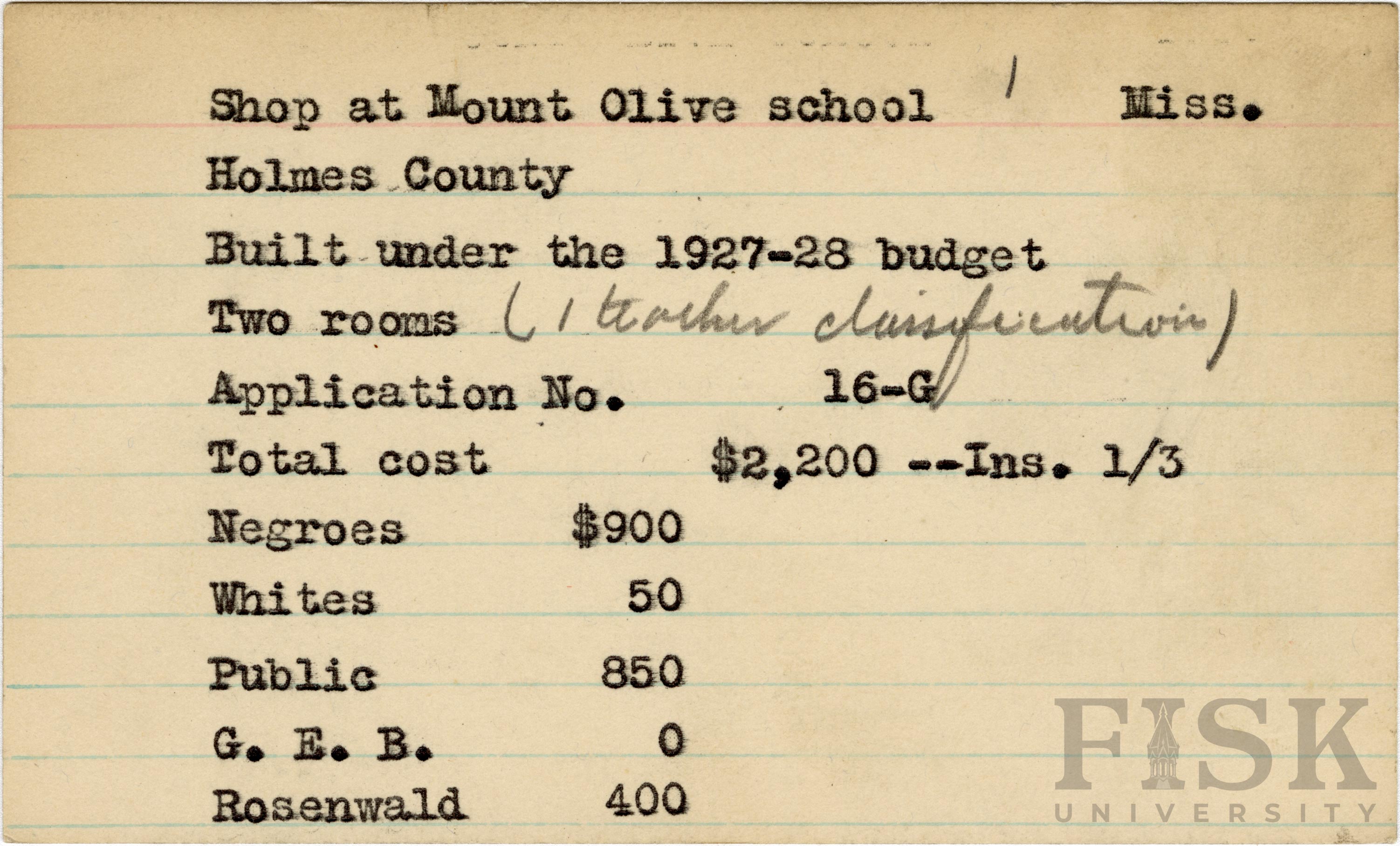 - School card from Rosenwald Fund for the two room shop at Mt. Olive School in Holmes County, Mississippi with a section added to the budget contributions that says, "Ins. 1/3" and another section that says, "G.E.B. $0"