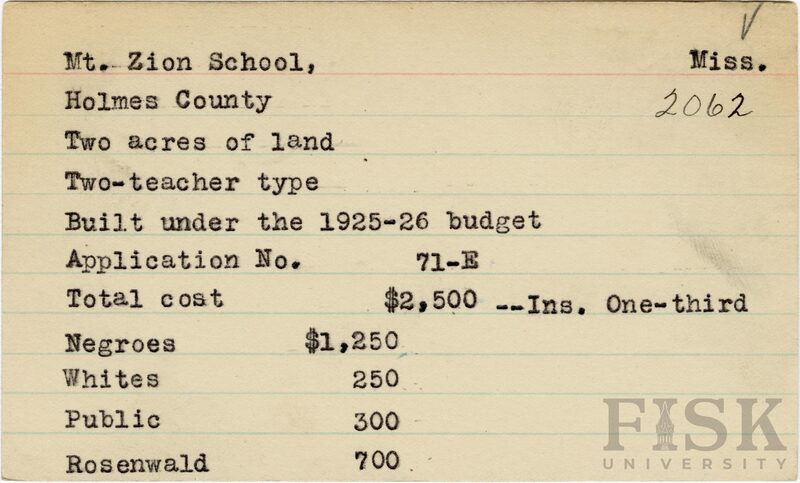 - School card from Rosenwald Fund for Mt. Zion School in Holmes County, Mississippi with a section added to the budget contributions that says, "Ins. One-third"