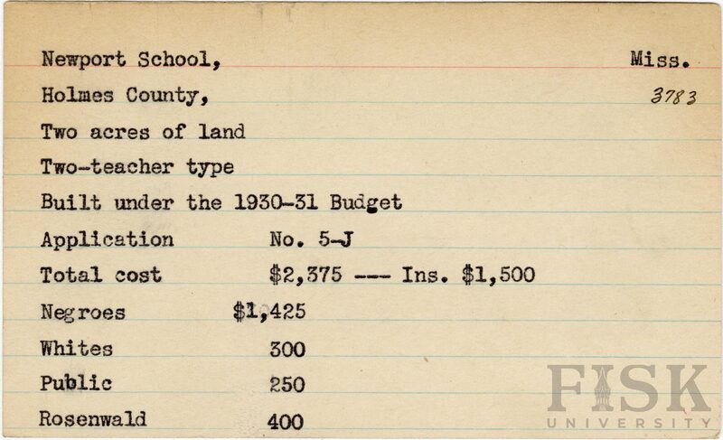 - School card from Rosenwald Fund for Newport School in Holmes County, Mississippi with a section added to the budget contributions that says, "Ins. $1,500"