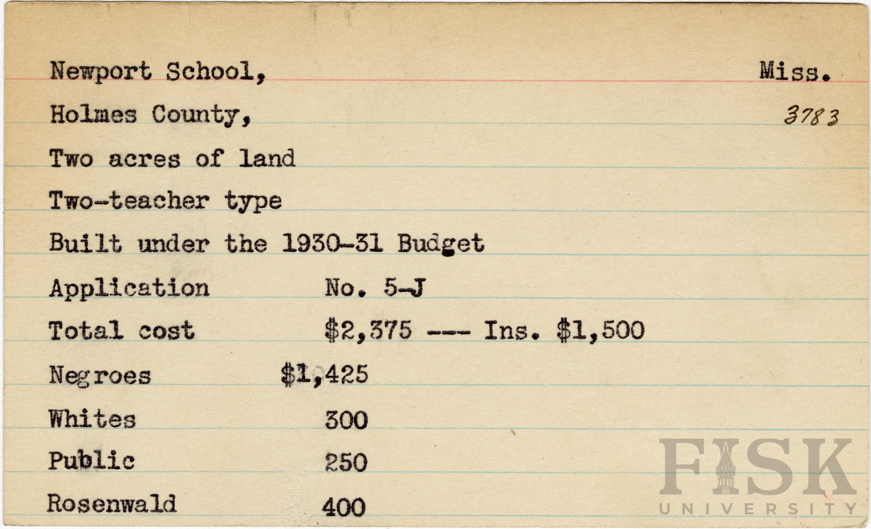 School card from Rosenwald Fund for Newport School in Holmes County, Mississippi with a section added to the budget contributions that says, "Ins. $1,500"