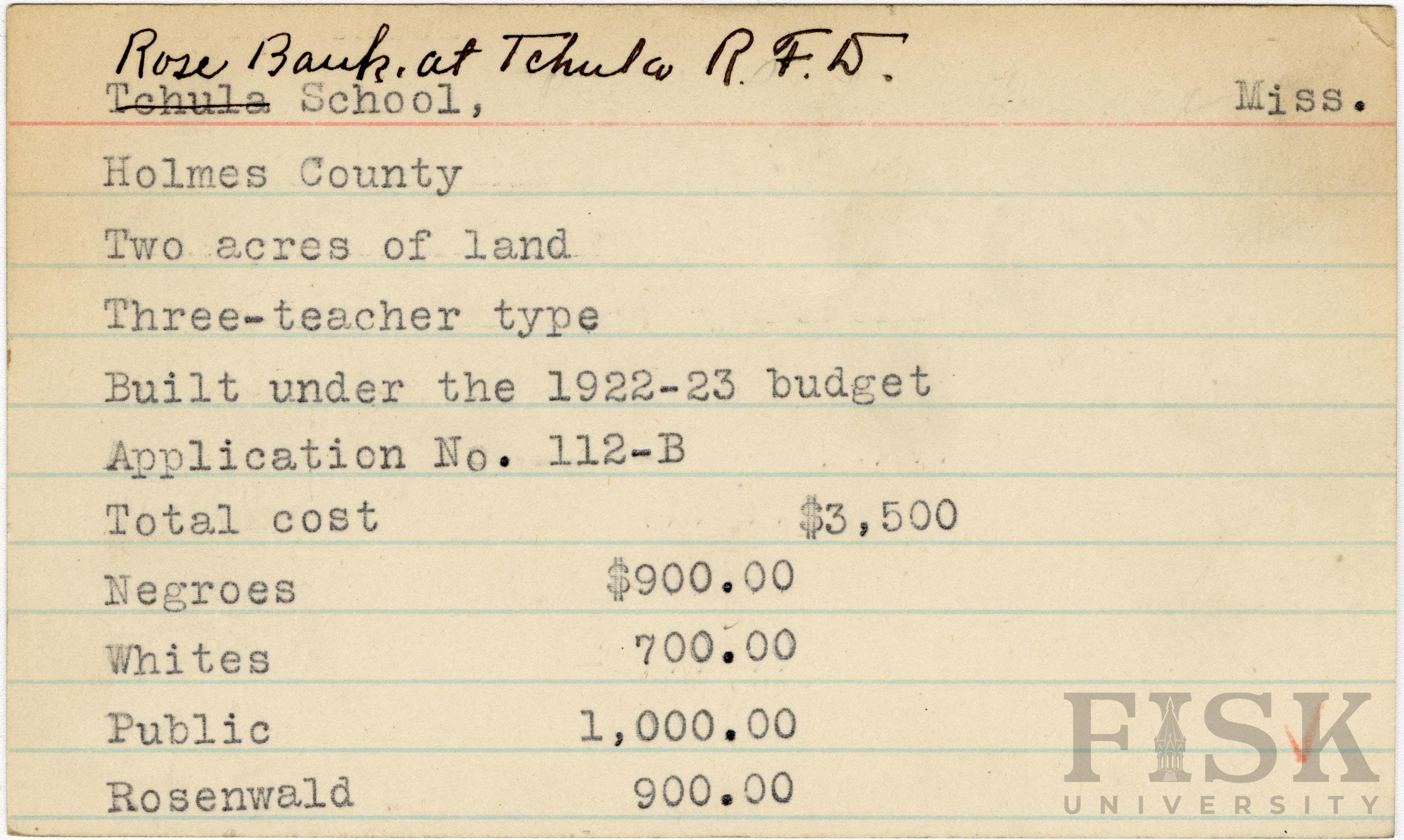 - School card from Rosenwald Fund for Rose Bank at Tchula R.F.S. in Holmes County, Mississippi