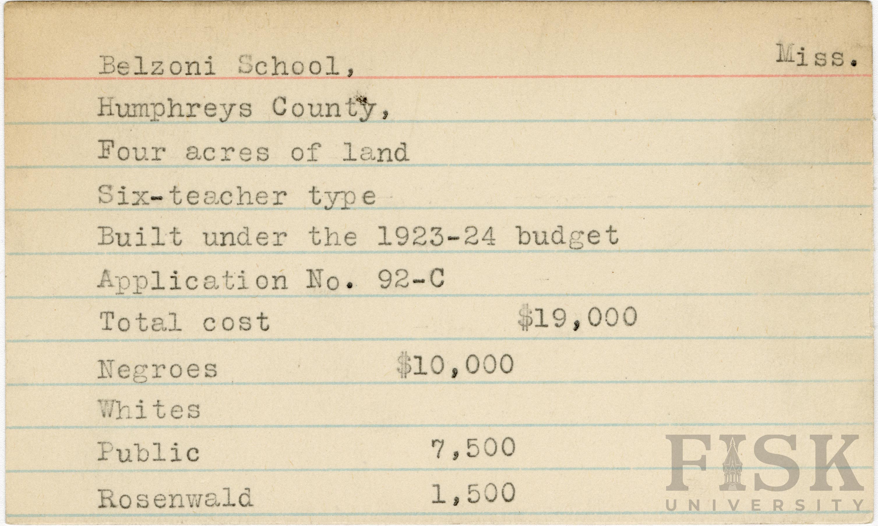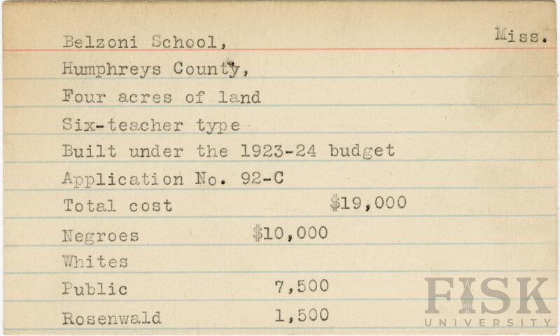 - School card from Rosenwald Fund for Belzoni School in Humphreys County, Mississippi
