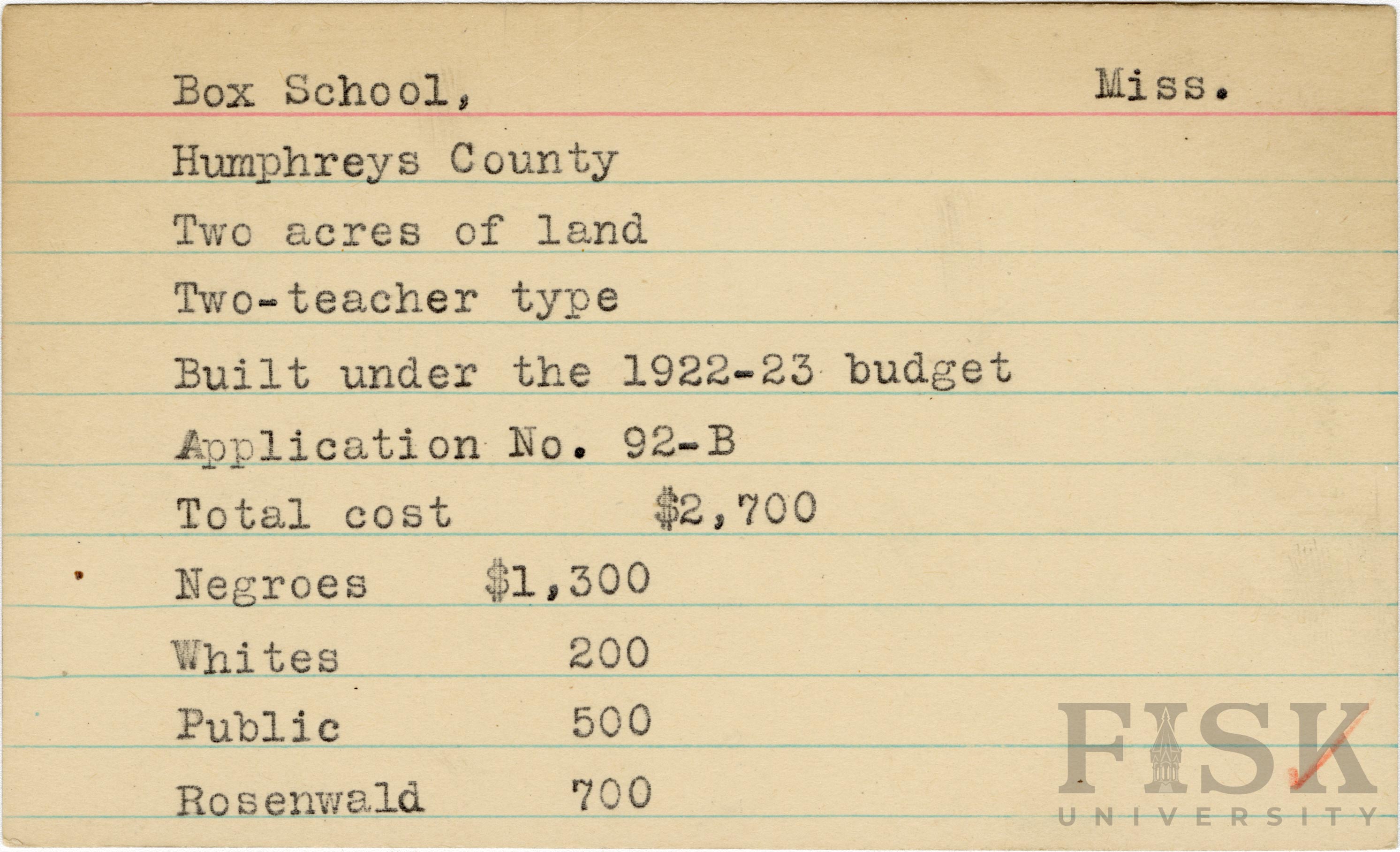 - School card from Rosenwald Fund for Box School in Humphreys County, Mississippi