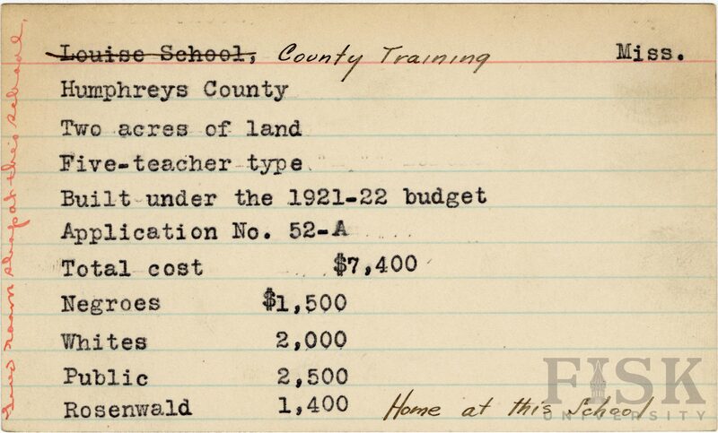 - School card from Rosenwald Fund for County Training School in Humphreys County, Mississippi with handwritten notes on the card that say, "two room shop at this school" and "home at this school"
