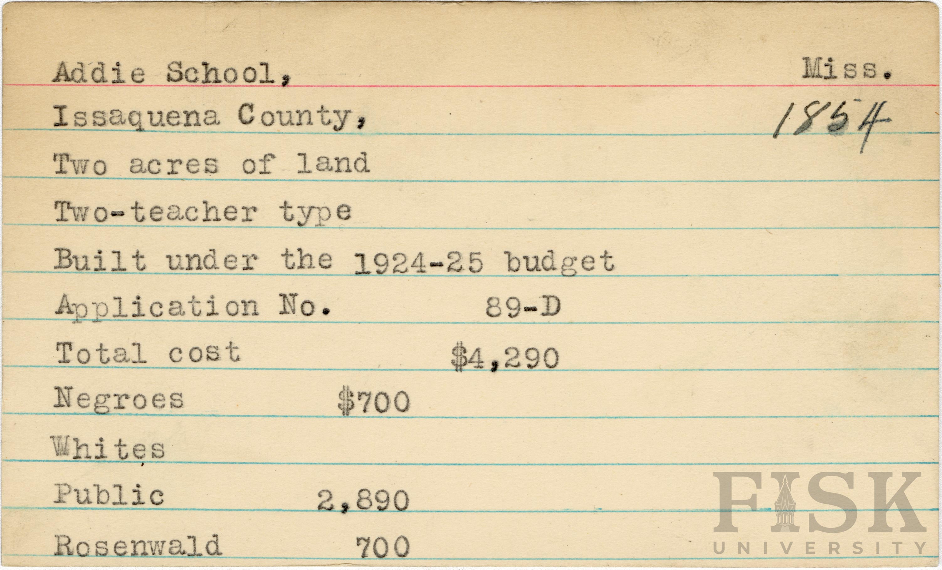 - School card from Rosenwald Fund for Addie School in Issaquena County, Mississippi
