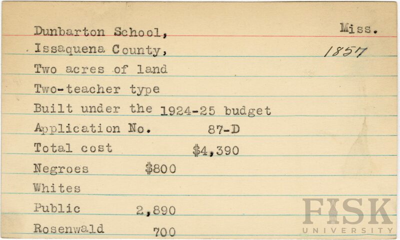 - School card from Rosenwald Fund for Dunbarton School in Issaquena County, Mississippi