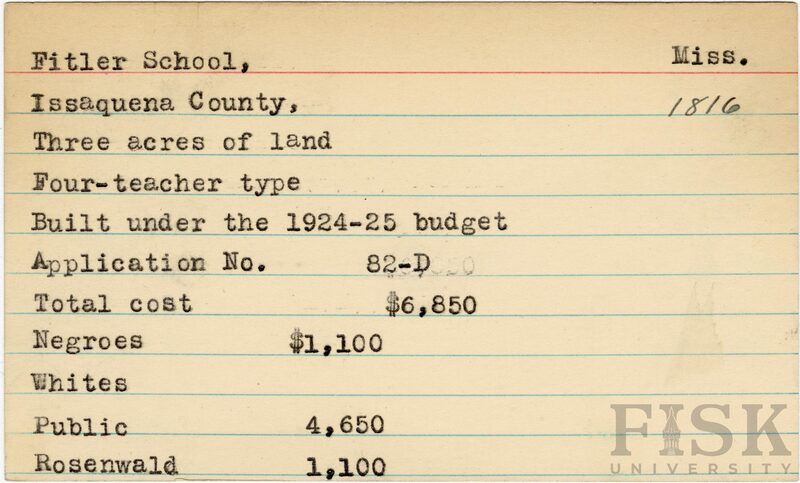 - School card from Rosenwald Fund for Fitler School in Issaquena County, Mississippi