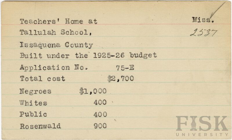 - School card from Rosenwald Fund for the teacher's home at Tallulah School in Issaquena County, Mississippi
