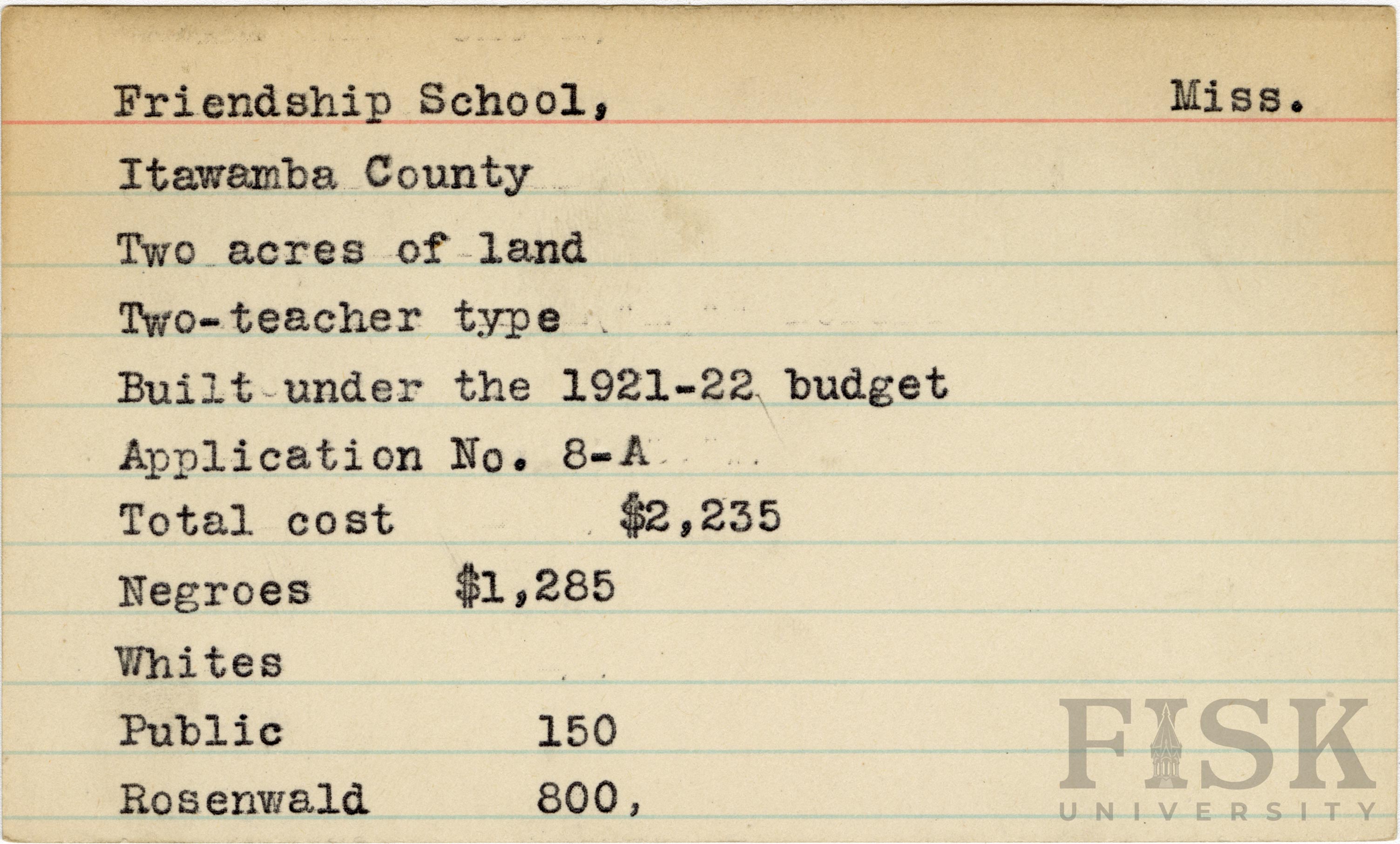 - School card from Rosenwald Fund for Friendship School in Itawamba County, Mississippi