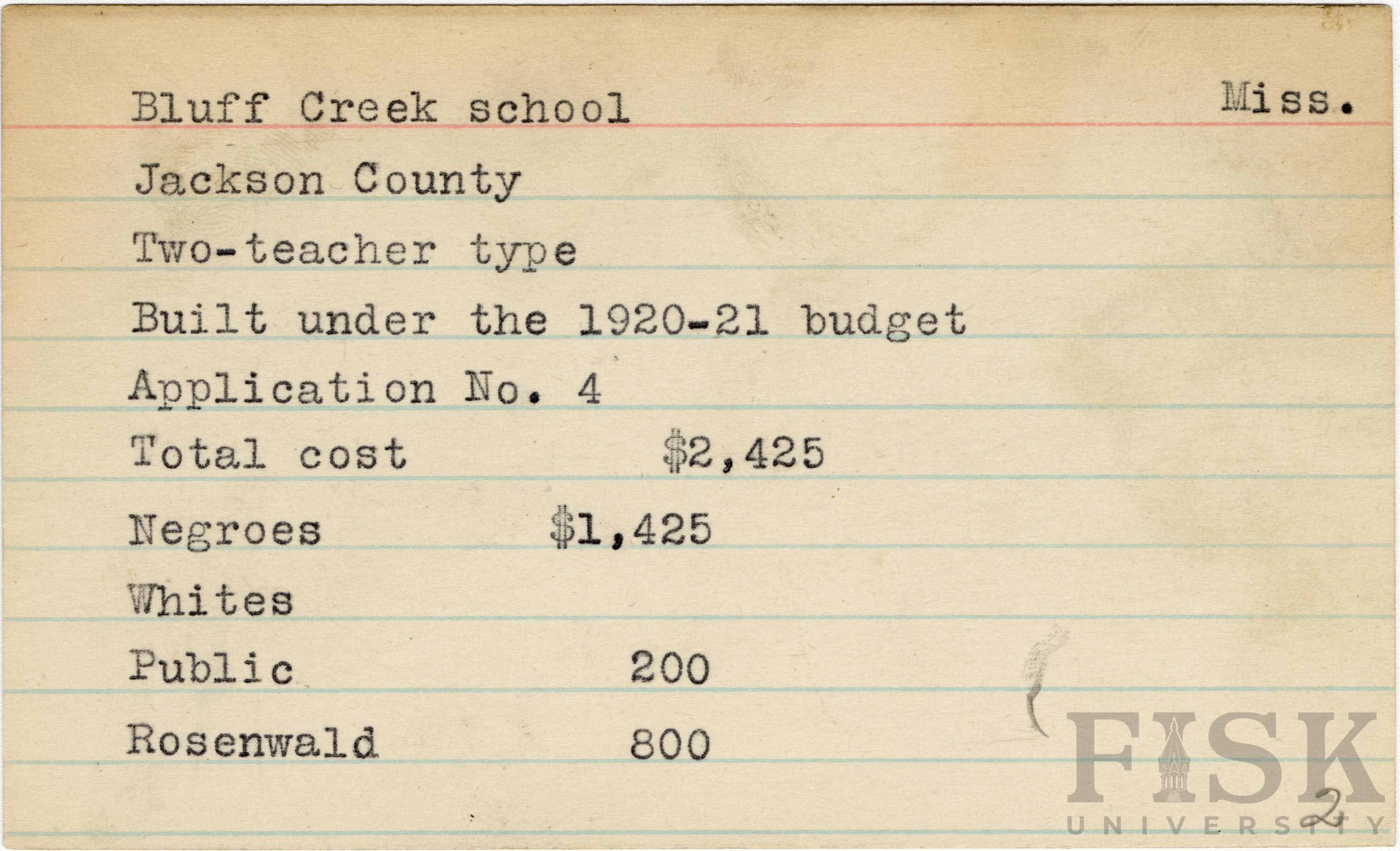 - School card from Rosenwald Fund for Bluff Creek School in Jackson County, Mississippi
