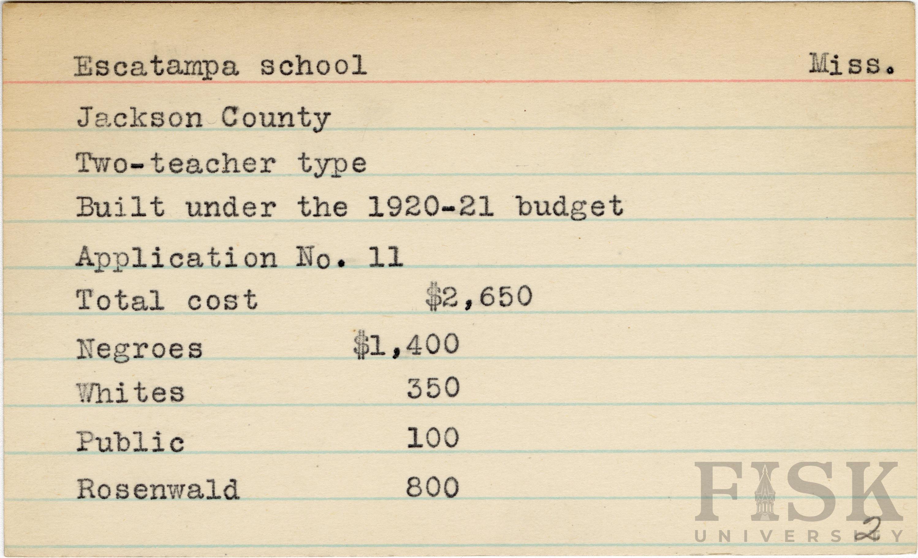 - School card from Rosenwald Fund for Escatampa School in Jackson County, Mississippi