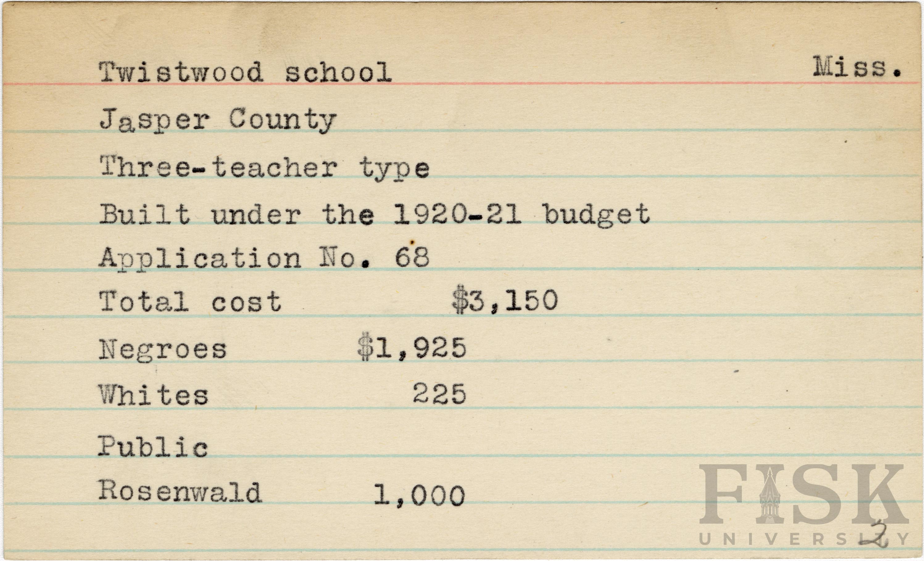 - School card from Rosenwald Fund for Twistwood School in Jasper County, Mississippi