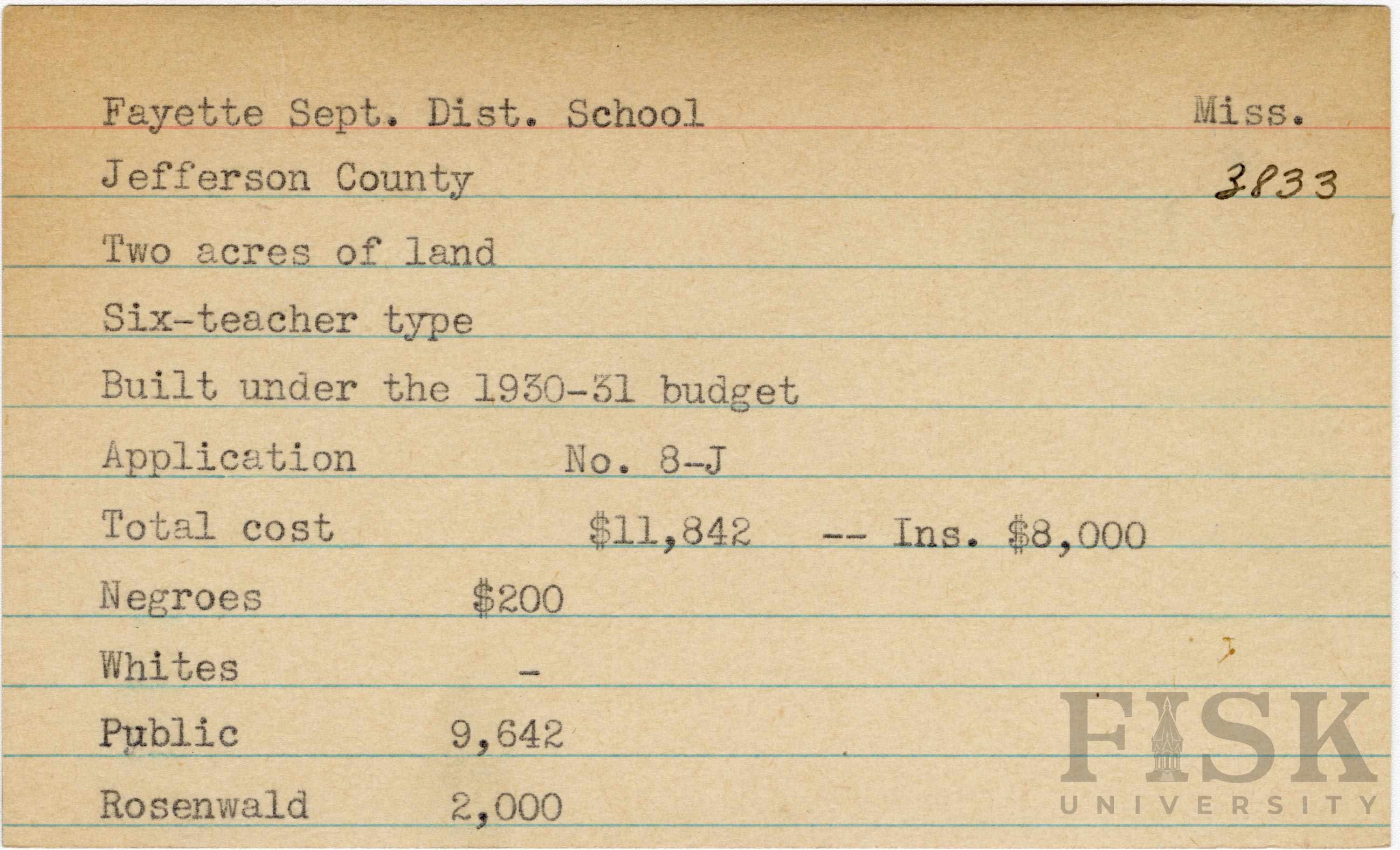 - School card from Rosenwald Fund for Fayette Sept. Dist. School in Jefferson County, Mississippi with a section added to the budget contributions that says, "Ins. $8,000"