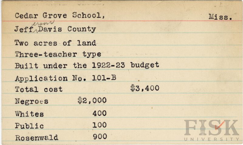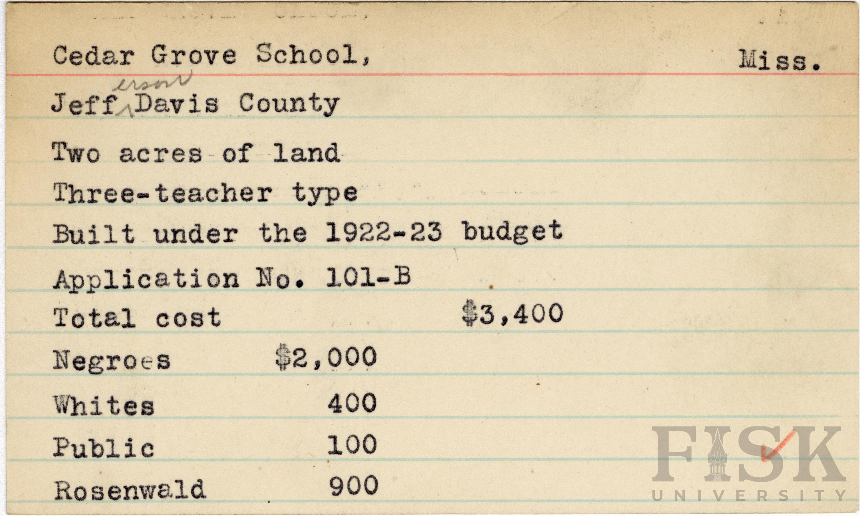 - School card from Rosenwald Fund for Cedar Grove School in Jefferson Davis County, Mississippi