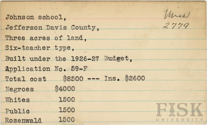 - School card from Rosenwald Fund for Johnson School in Jefferson Davis County, Mississippi with a section added to the budget contributions that says, "Ins. $2,600"