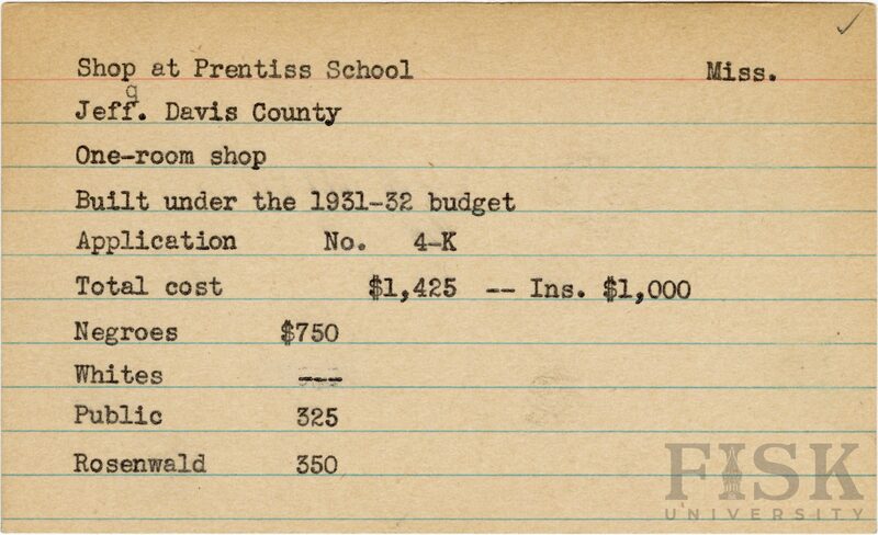 - School card from Rosenwald Fund for the one-room shop at Prentiss School in Jefferson Davis County, Mississippi with a secton added to the budget contributions that says, "Ins. $1,000"