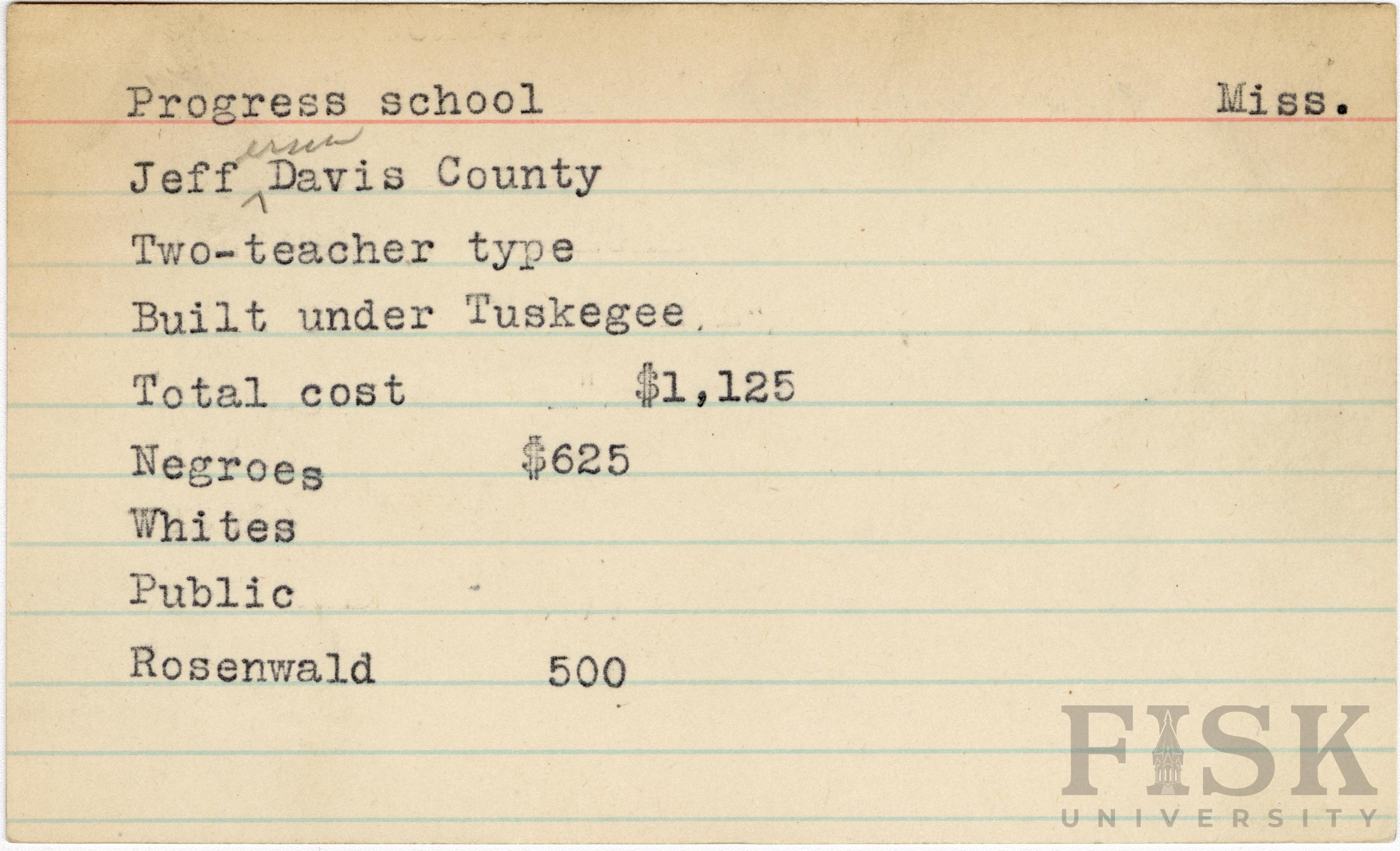 - School card from Rosenwald Fund for Progress School in Jefferson Davis County, Mississippi