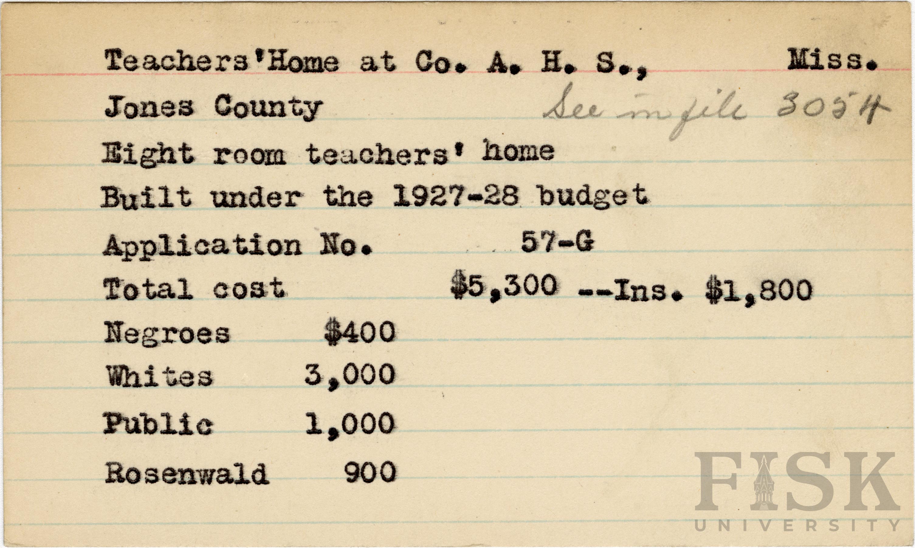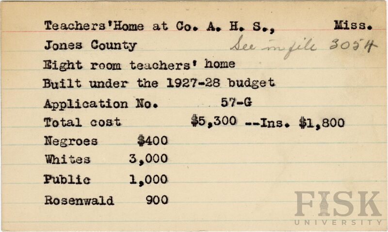 - School card from Rosenwald Fund for the eight room teacher's home at County Agriculture High School in Jones County, Mississippi with a section added to the budget contributions that says, "Ins. $1,800"