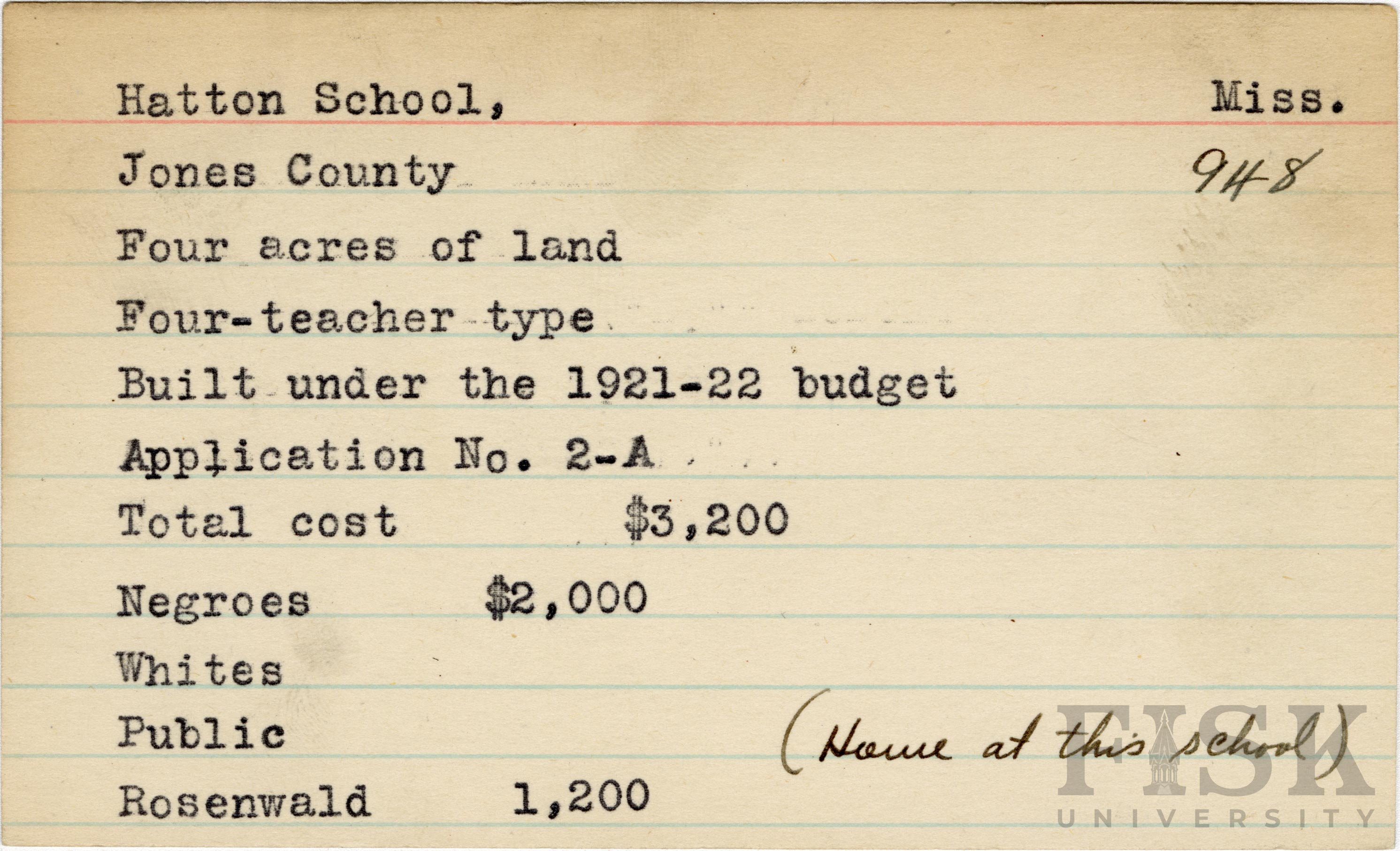 - School card from Rosenwald Fund for Hatton School in Jones County, Mississippi with a handwritten note on the card that says, "(Home at this school)"