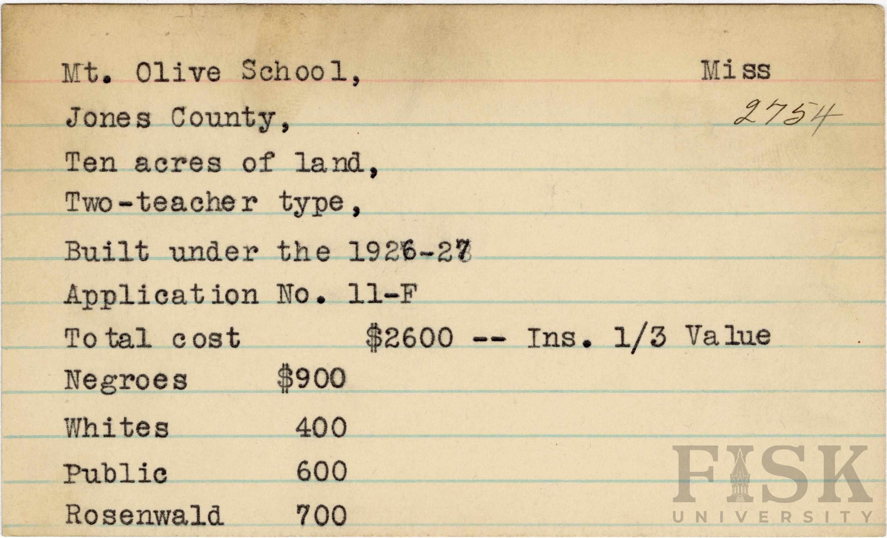 - School card from Rosenwald Fund for Mt. Olive School in Jones County, Mississippi with a section added to the budget contributions that says, "Ins. 1/3 Value"