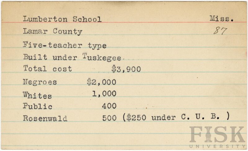 - School card from Rosenwald Fund for Lumberton School in Lamar County, Mississippi with an addition next to the Rosenwald budget contribution that says, "($250 under C.U.B.)"