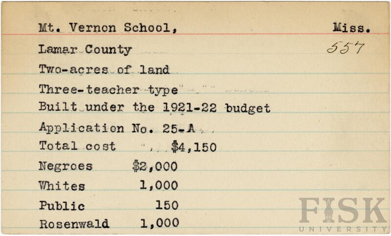 - School card from Rosenwald Fund for Mt. Vernon School in Lamar County, Mississippi